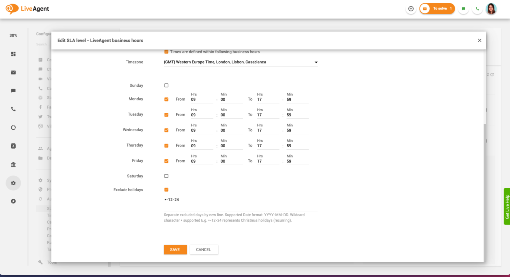 LiveAgents Åpningstider konfigurerer sla-nivåene dine til å bare iverksettes til spesifiserte tidsperioder, med mulighet for å ekskludere helligdager.