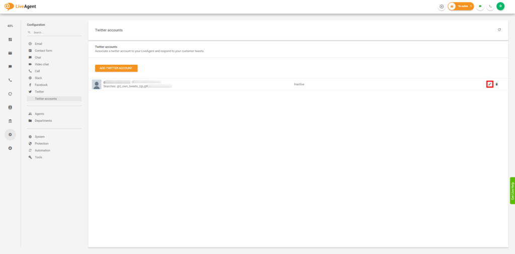 - Når din LiveAgent-konto er koblet til Twitter, klikk på Rediger for å aktivere kontoen
