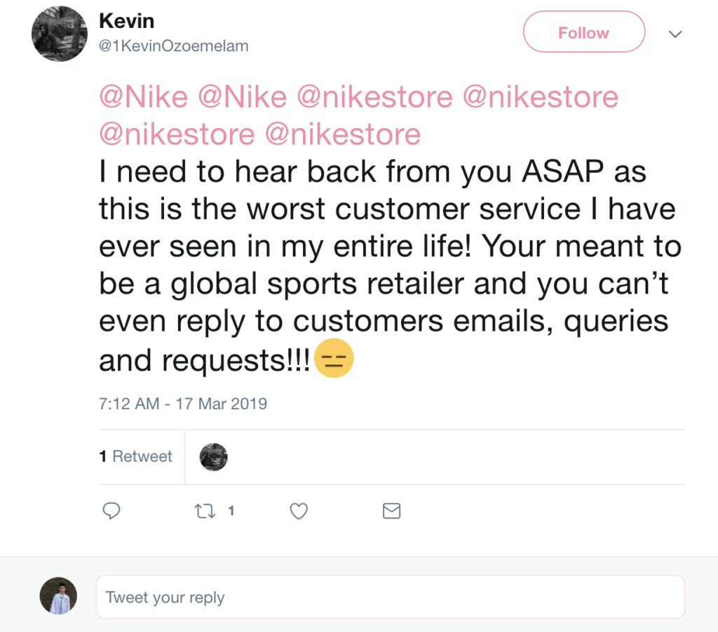 Fordi Twitter er ansett som en såkalt “alltid på”-kanal forventer kunder (både eksisterende og potensielle) og bli anerkjent på plattformen når de forsøker å nå et selskap. Ofte vil et selskap som ikke lykkes med å respondere raskt og tilfredsstillende til kunder møte misnøye, kanselleringskultur og boikott.