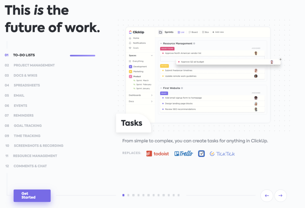 ClickUp er en skybasert samarbeids- og prosjektstyringsløsning laget for virksomheter i alle størrelser og alle typer spesialisering. Den tilbyr en rekke kraftige funksjoner laget for oppgavebehandling, for eksempel varsler, oppgavetildelinger og statuser.