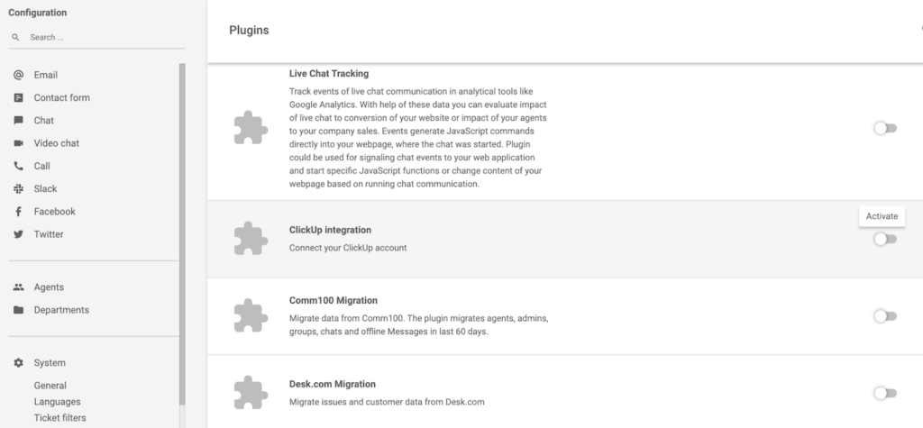 - For å integrere ClickUp, åpne LiveAgent og gå til Konfigurasjon > System > Programtillegg. Finn ClickUp-plugin-modulen i listen, klikk på aktiveringsknappen og LiveAgent vil starte seg selv på nytt.