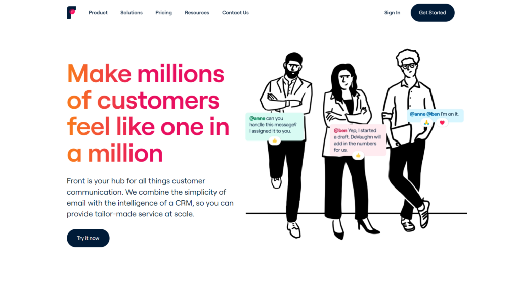 Front er et klagebehandlingssystem som hjelper bedrifter med å holde oversikt over sine kundeklager. Front bruker analyser for å finne vanlige problemområder og gjøre det enkelt for kunder å be om hjelp med spesifikke problemer.