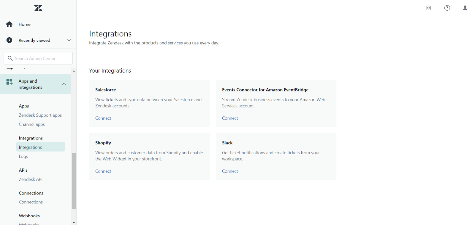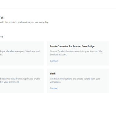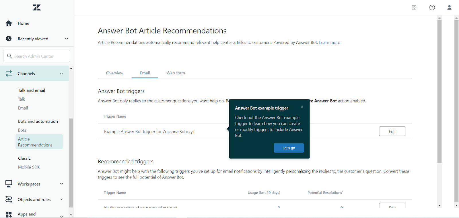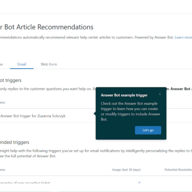 Når det gjelder de tilgjengelige funksjonene, ble jeg positivt overrasket over noen få. For det første kan du sette opp en svarbot med artikkelanbefalinger for kundene dine, noe jeg synes er kjempebra. For det andre er det mulig å integrere Zendesk med et fint utvalg av verktøy mange bruker hver dag, som Slack eller Shopify.