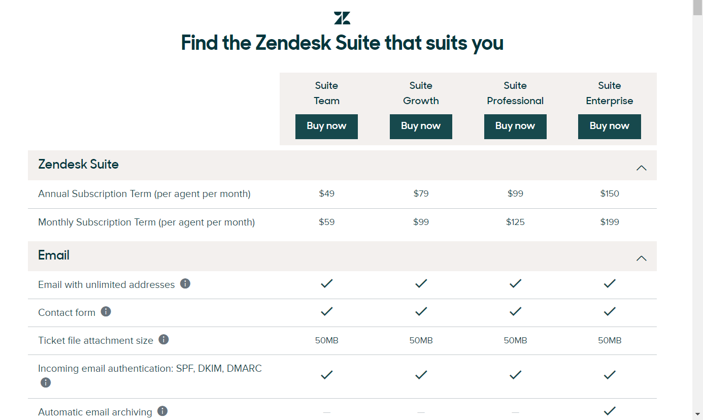 Suite Team er den billigste planen som tilbys av Zendesk. Inne i den kan du finne funksjoner som e-post, tale- og SMS-støtte, meldinger på tvers av nett-, mobil- og sosiale plattformer, samt et enkelt hjelpesenter. Du kan også sette opp til 50 AI-drevne automatiske svar.