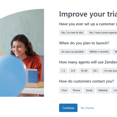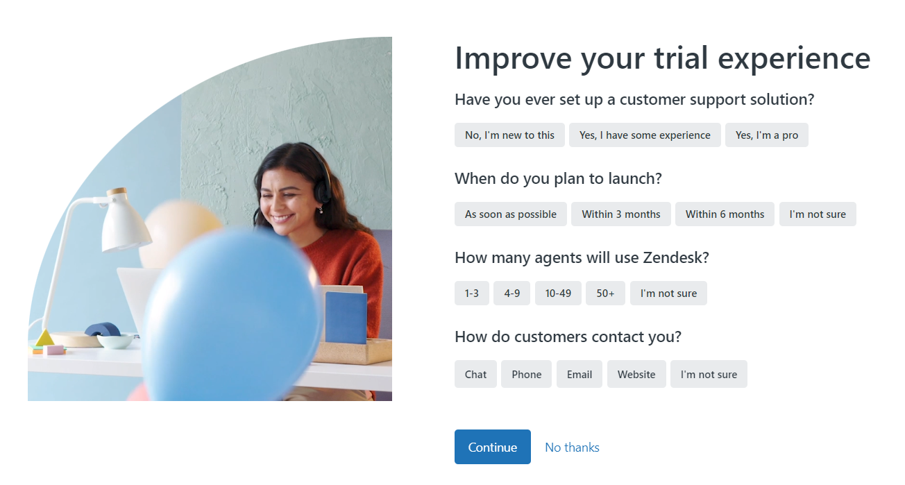 Rett etter registrering ble jeg møtt med noen måter å forbedre opplevelsen av prøveversjonen på. Ved å svare på 4 enkle spørsmål fra Zendesk, var jeg i stand til å gjøre noen positive endringer i prøveversjonen min som ville få meg til å nyte den mer.