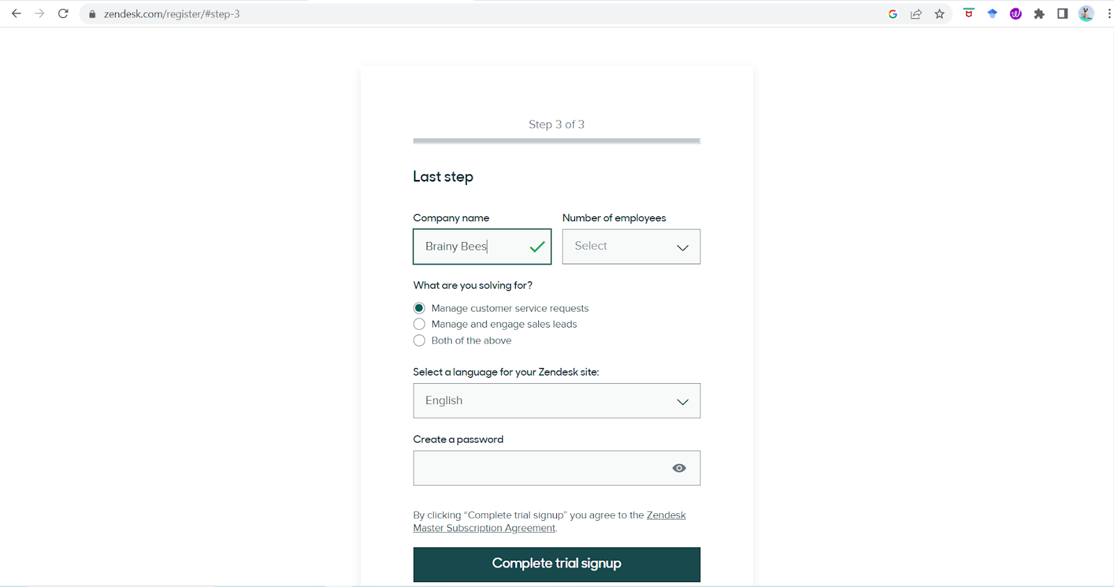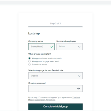 For å komme i gang med Zendesks chatbots, gikk jeg til nettstedet deres og klikket på «Gratis prøveversjon»-knappen. Det var da jeg kunne starte registreringsprosessen. Totalt tok alt meg omtrent 20 minutter. Det var lengre enn å registrere seg hos andre løsninger, noen av dem tok bare noen få minutter. Likevel syntes jeg det var greit. Det er verdt å merke seg at jeg måtte vente i omtrent 18 minutter for å få bekreftelses-e-posten min. Det er dette som gjorde registreringsprosessen så lang. Når du oppretter kontoen din for å dra nytte av en prøveversjon, blir du bedt om å oppgi følgende detaljer: