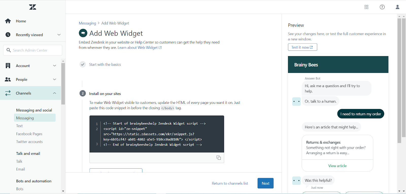 Når det gjelder implementering av chatbot, fant jeg ikke noe jeg kunne klage på her. Ved å følge instruksjonene fra Zendesk, var jeg i stand til å navigere gjennom hele prosessen ganske enkelt og uten større innsats.
