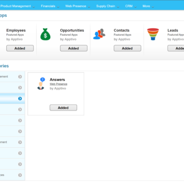 Apptivo er en omfattende programvare med mange funksjoner, så det er helt naturlig at grensesnittet ikke er det enkleste å navigere. En rask titt og klikk på alle mulige menyelementer hjalp meg ikke med å finne ut hvor kunnskapsbasen er, og det gjorde heller ikke søkewidgeten i topppanelet. Apptivo er kjent for sin omfattende appliste, så jeg prøvde å søke etter en kunnskapsbase-app som kunne legges til systemet. Jeg lyktes heller ikke med dette alternativet.