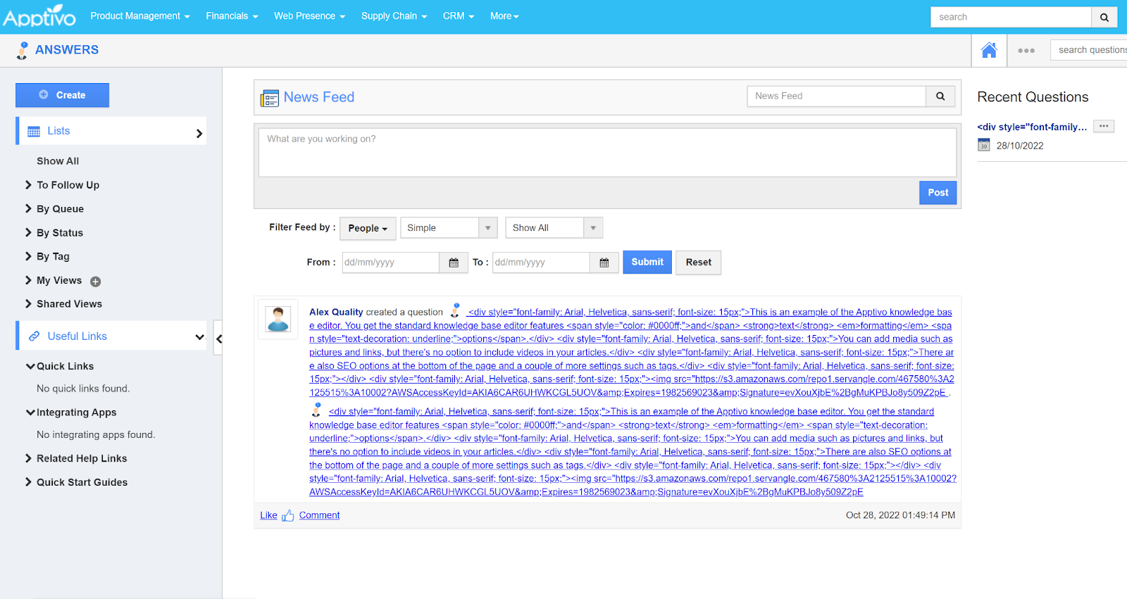 Apptivo-kunnskapsbasen er en ganske enkel kunnskapsbase, som etterlater den i gjennomsnittlig rekkevidde når det gjelder appell sammenlignet med de andre der ute. Designet er funksjonelt og det er det som betyr mest. Det venstre panelet inneholder filtreringsalternativer og knappen for å lage en ny artikkel. Når du har kommet inn i kunnskapsbasen, kan du se hele listen over artikler du har. Hvis du nettopp har startet, kommer det åpenbart til å være tomt, så la oss sette i gang med å fikse det med en gang.
