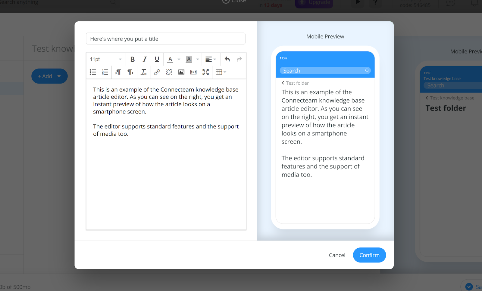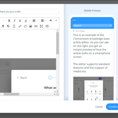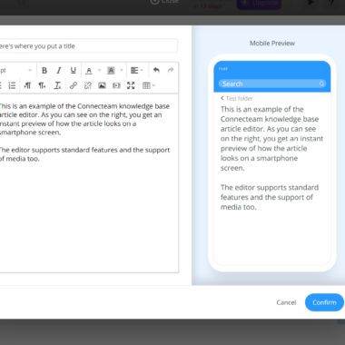 Connecteam fokuserer på smarttelefonbrukere, så kunnskapsbasegrensesnittet presser mobilapplikasjonen sterkt, noe som bringer oss til den andre utgaven – kunnskapsbaseartikkelredaktøren. Kunnskapsbasens artikkelredigering er utrolig liten, pakket inn i et tett vindu der det meste av skjermen er fylt med en representasjon av hvordan artikkelen din ser ut på smarttelefoner. Dette er utvilsomt en nyttig ting å se, og jeg kan ikke huske å ha sett det i mange fremtredende programvareløsninger for kunnskapsbase, men hvorfor må det ta over halvparten av vinduet? Det fjerner fokus fra å skrive, og det fyller i hovedsak plass der mer nyttige funksjoner kan være. Selv om det ikke er umulig å skrive her, føles det definitivt begrensende og helt unødvendig. Alternativet for forhåndsvisning av smarttelefon er et flott tillegg, men det bør være valgfritt, ikke obligatorisk, da det ikke er mulig å minimere det eller slå det av direkte i redigeringsprogrammet.