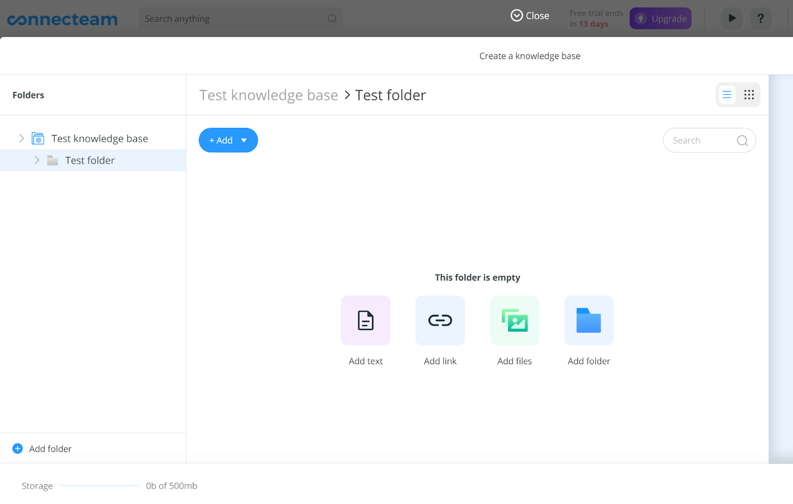 var ikke et alternativ for å lage en ny artikkel synlig hvor som helst, selv etter å ha sett hele brukergrensesnittet grundig. Etter hvert fant jeg ut at du først må klikke på kunnskapsbasemappen, klikke på Rediger, klikke på mappen du vil legge artikkelen til, og til slutt klikke på Legg til tekst . Dette er veldig lite intuitivt, og jeg kan forstå frustrasjonen til en bruker som leter etter en måte å legge til en ny artikkel i en hast (med en tidsfrist som kommer snikende bak dem).