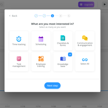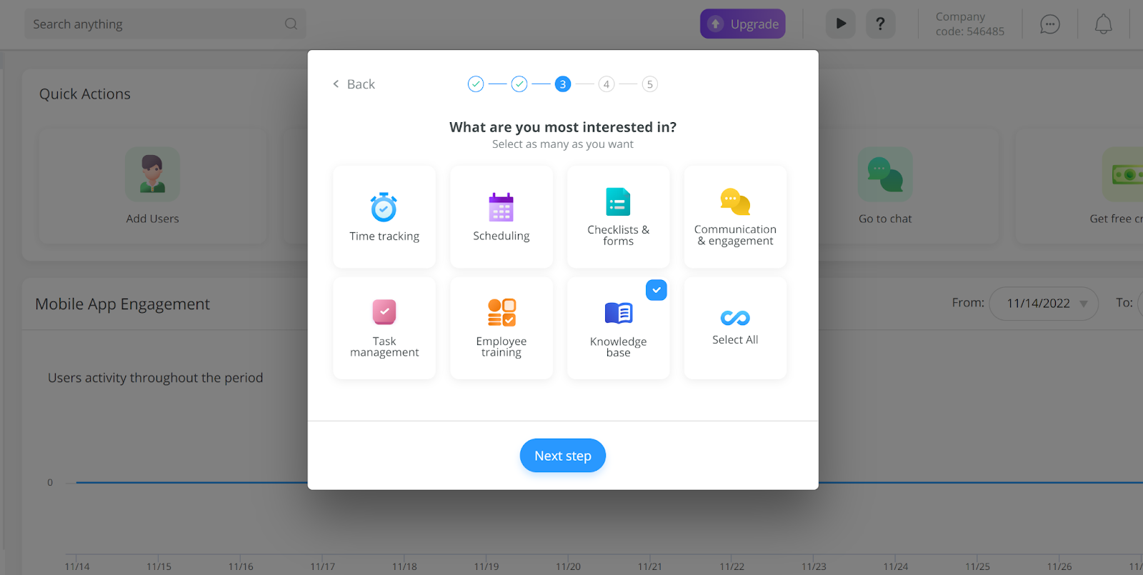 Å starte med Connecteam starter med en klassisk prøveregistrering, med mindre du vil velge en betalt plan med en gang. Etter å ha fullført registreringen, vil Connecteam veilede deg gjennom oppsettet. Du kan legge til firmanavn, rolle, antall ansatte og den primære bruken av Connecteam. Det er også alternativet som kan hoppes over for å legge til en logo, og telefonnummeret ditt for å laste ned Connecteam-mobilappen (hvis du vil ha det). Prosessen er veldig enkel og tar bare et par minutter å fullføre. Etterpå kan du begynne å bli kjent med grensesnittet i nettappen.