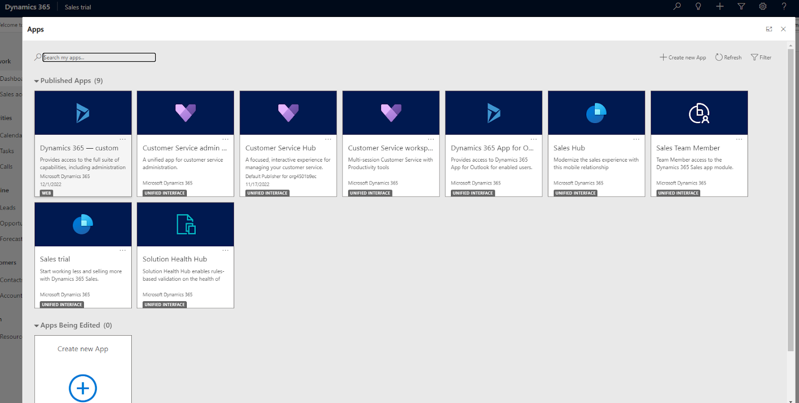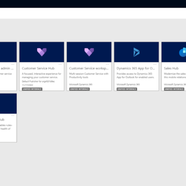 Imidlertid, som du kan se på skjermbildet ovenfor, er tittelen på denne siden “Salgsdashbord”. Jeg fant raskt ut at jeg måtte bytte til en annen app for å begynne å lage en kunnskapsbase, så etter at jeg hadde en rask titt rundt i høyre sidepanel, fant jeg alle appene Dynamics 365 tilbyr.