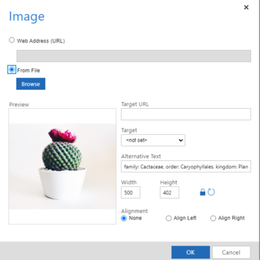 Det er også veldig enkelt å legge til bilder. Du kan gjøre det ved å bruke en nettadresse eller laste opp bildet direkte fra datamaskinen. Du kan justere bildestørrelsen, angi justeringen og målet før du legger det til innholdet ditt, eller etterpå.