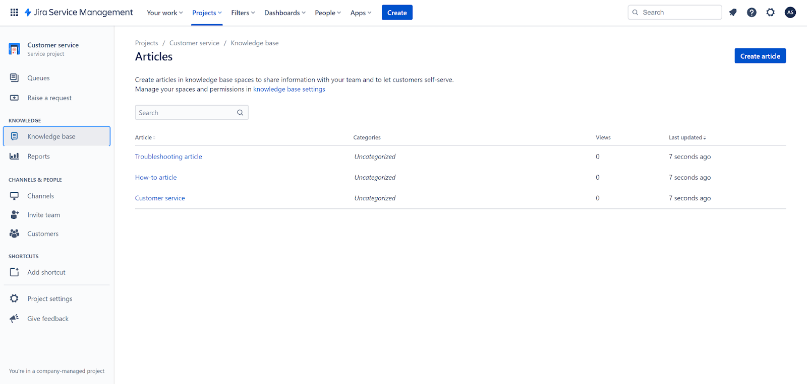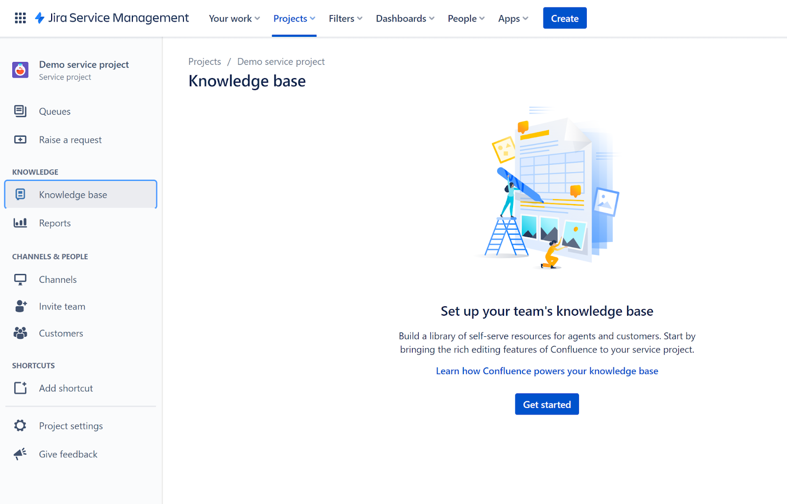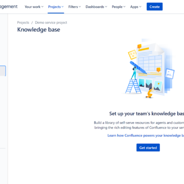 Jira Service Management tilbyr brukerne å opprette og administrere ulike typer prosjekter for hver side av virksomheten deres. Du kan for eksempel opprette et kundeserviceprosjekt, et salgsprosjekt og et økonomistyringsprosjekt samtidig. Du kan ha en egen kunnskapsbase for hvert av disse prosjektene, og fylle den med relevante artikler for hvert prosjekt. Kunnskapsbasen er tilgjengelig ved å klikke på et hvilket som helst prosjekt og velge alternativet for kunnskapsbase fra venstre menylinje. Du må imidlertid først få en Confluence-konto. Confluence er et eget produkt fra Atlassian, som fokuserer på dokumenthåndtering. Du kan få det gratis fra den offisielle nettsiden. Etterpå vil kunnskapsbasefunksjonen din i enhver Jira Service Management fungere korrekt.