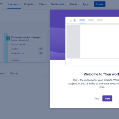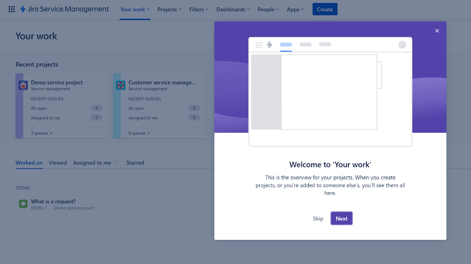 Når du er ferdig med prosjektmalen din, vil du bli introdusert for Jira Service Management-dashbordet. Det ser ganske bra ut, og du kan ta en kort introduksjonsopplæring som forklarer hvordan grensesnittet fungerer. Grensesnittet ser ganske moderne ut, og det gjør sitt beste for å holde ting enkelt og lett å navigere. Dette kan endres når du legger til flere prosjekter, men hovedgrensesnittet skal forbli så rent som det kan uansett. Når du er ferdig med det, kan du se prosjektene dine i dashbordet.