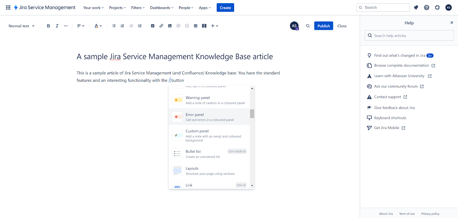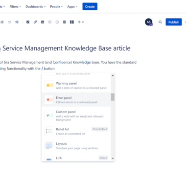 Denne funksjonen er dypt integrert med andre Jira-funksjoner, slik at du kan få tilgang til dem hvis du har tilgang til andre Jira-verktøy. Det kan være veldig tidkrevende å bla gjennom alle alternativene, og det er derfor du alltid bør begynne å skrive navnet på et bestemt element og spare deg selv for litt tid. Bortsett fra det er det en flott funksjon å ha og kan hjelpe deg med å få kunnskapsbaseartiklene dine til å skinne, noe som ikke er et garantert alternativ i enhver kunnskapsbaseprogramvare.