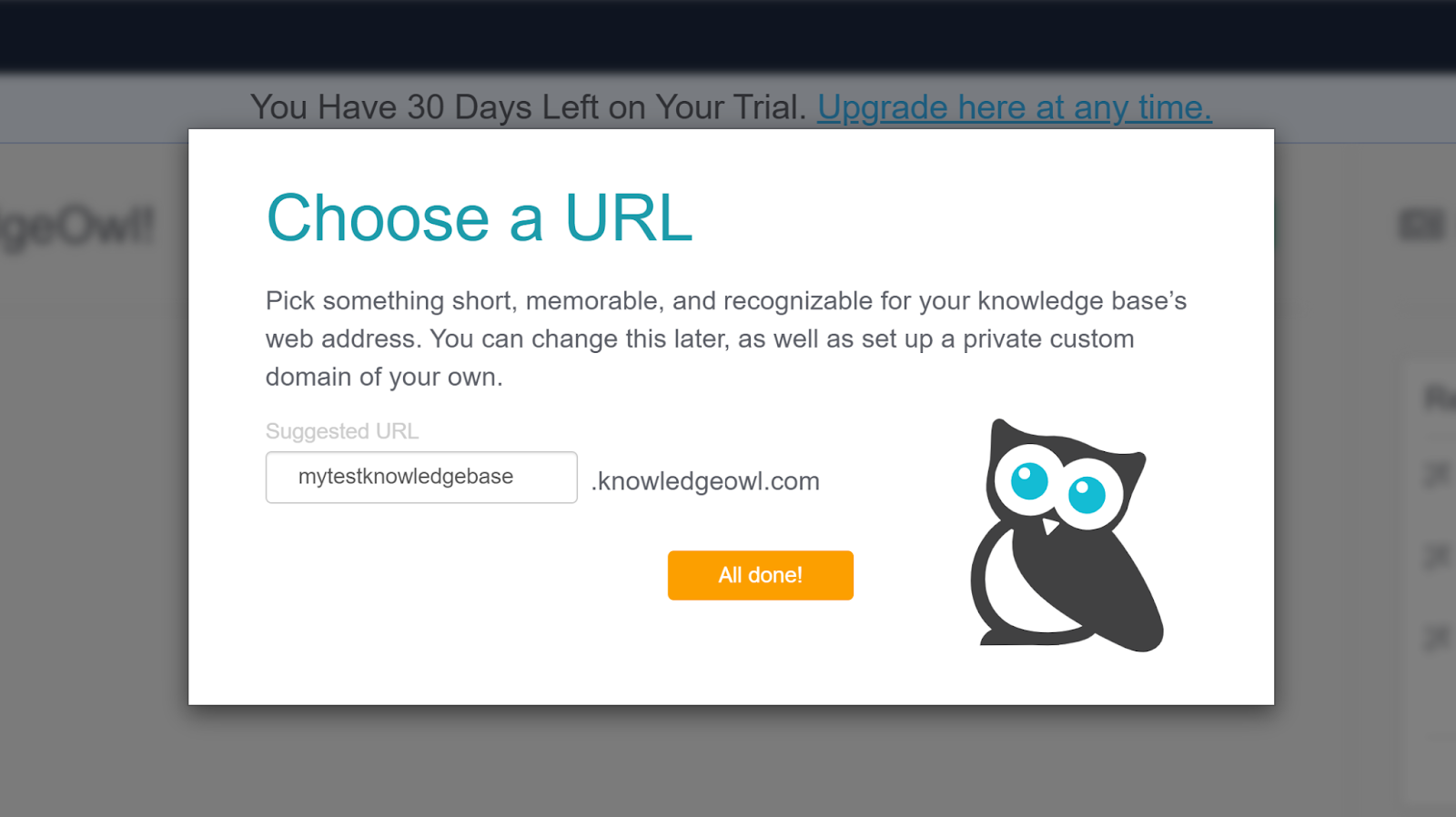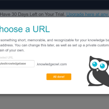 Alt du trenger for å prøve KnowledeOwl er å registrere en ny konto med bare e-postadressen din, og du kan komme i gang. KnowledgeOwl vil lede deg gjennom starten med et enkelt sett med alternativer der du kan fylle ut forfatternavnet ditt, navngi kunnskapsbasen din og velge en URL for kunnskapsbasen din. Etter det vil du bli ønsket velkommen til grensesnittet, og du kan begynne å bla gjennom applikasjonen.