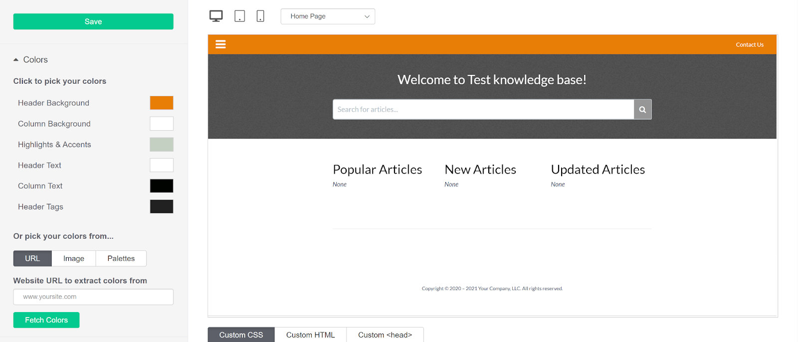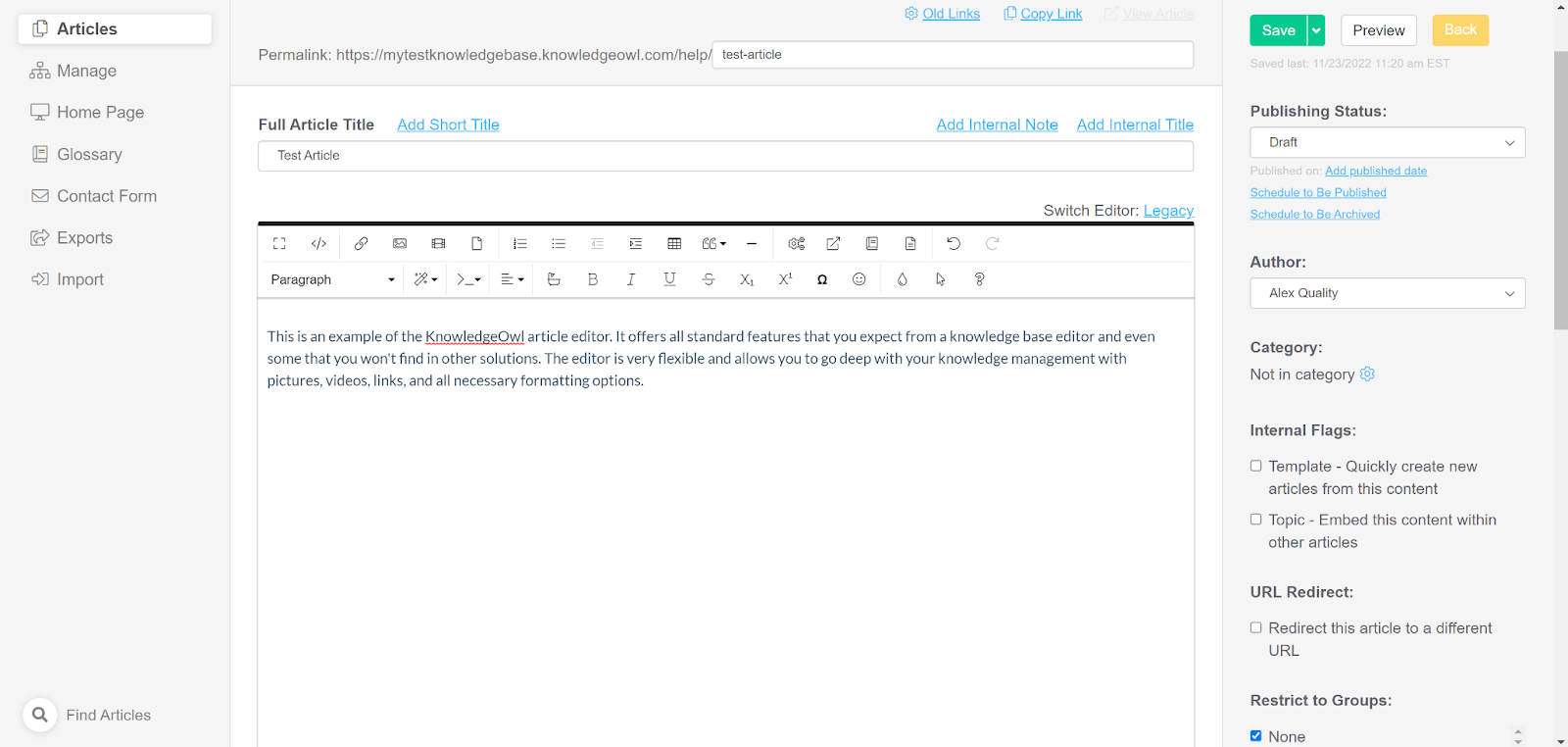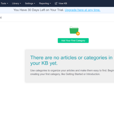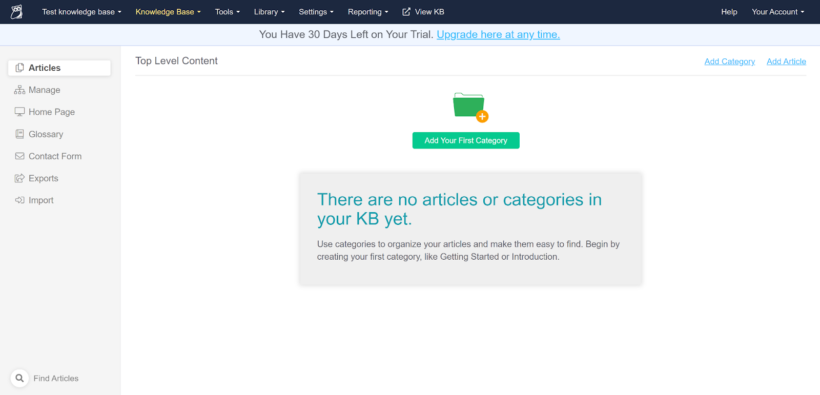 Siden KnowledgeOwl er en dedikert kunnskapsbaseprogramvare uten noen annen funksjonalitet, er det ikke nødvendig å søke etter kunnskapsbasefunksjonen i det hele tatt. Du kan legge inn det helt fra starten, og komme til å skrive guider og artikler uten å søke. Du kan imidlertid bli kjent med andre kunnskapsbaseverktøy og funksjoner inkludert i den øvre menyen. Du kan gå inn i hele biblioteket med artiklene dine senere, eller utforske de omfattende innstillingsalternativene. Det er mange alternativer, inkludert å endre tilgangsnivået til kunnskapsbasene dine, sette opp stilen og designen til kunnskapsbasen din, sikkerhetsalternativer og mye mer.