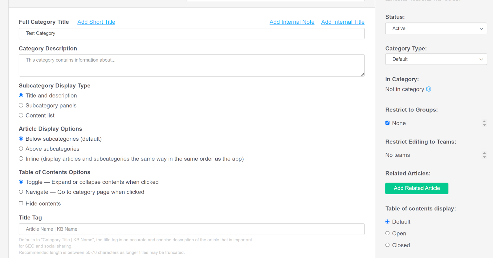 Du må først opprette en artikkelkategori. Alternativet er synlig etter at du først har gått inn i kunnskapsbasen din. Når du oppretter og går inn i en kategori, vil du se muligheten til å opprette en underkategori for enkel organisering av artiklene dine. Du kan også velge et navn og en stil for underkategorien din.