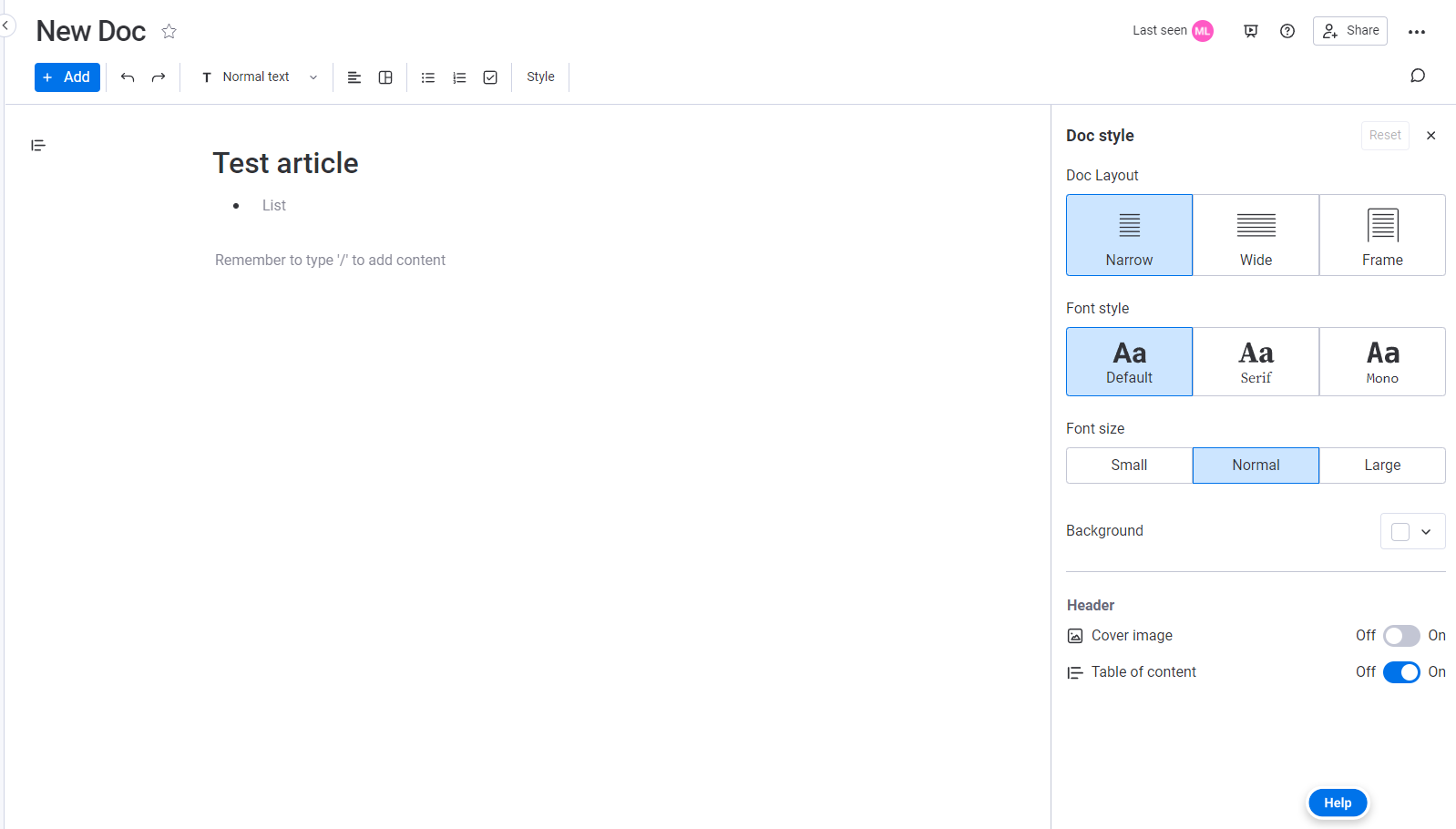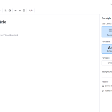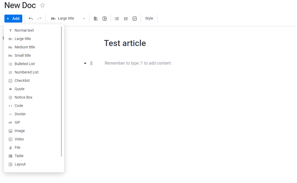 For å begynne å skrive en kunnskapsbaseartikkel, gå til Arbeidsområde-panelet til venstre på skjermen. Klikk på Legg til-alternativet og velg Nytt dokument. Når du har gjort det, kan du lage ditt første dokument.