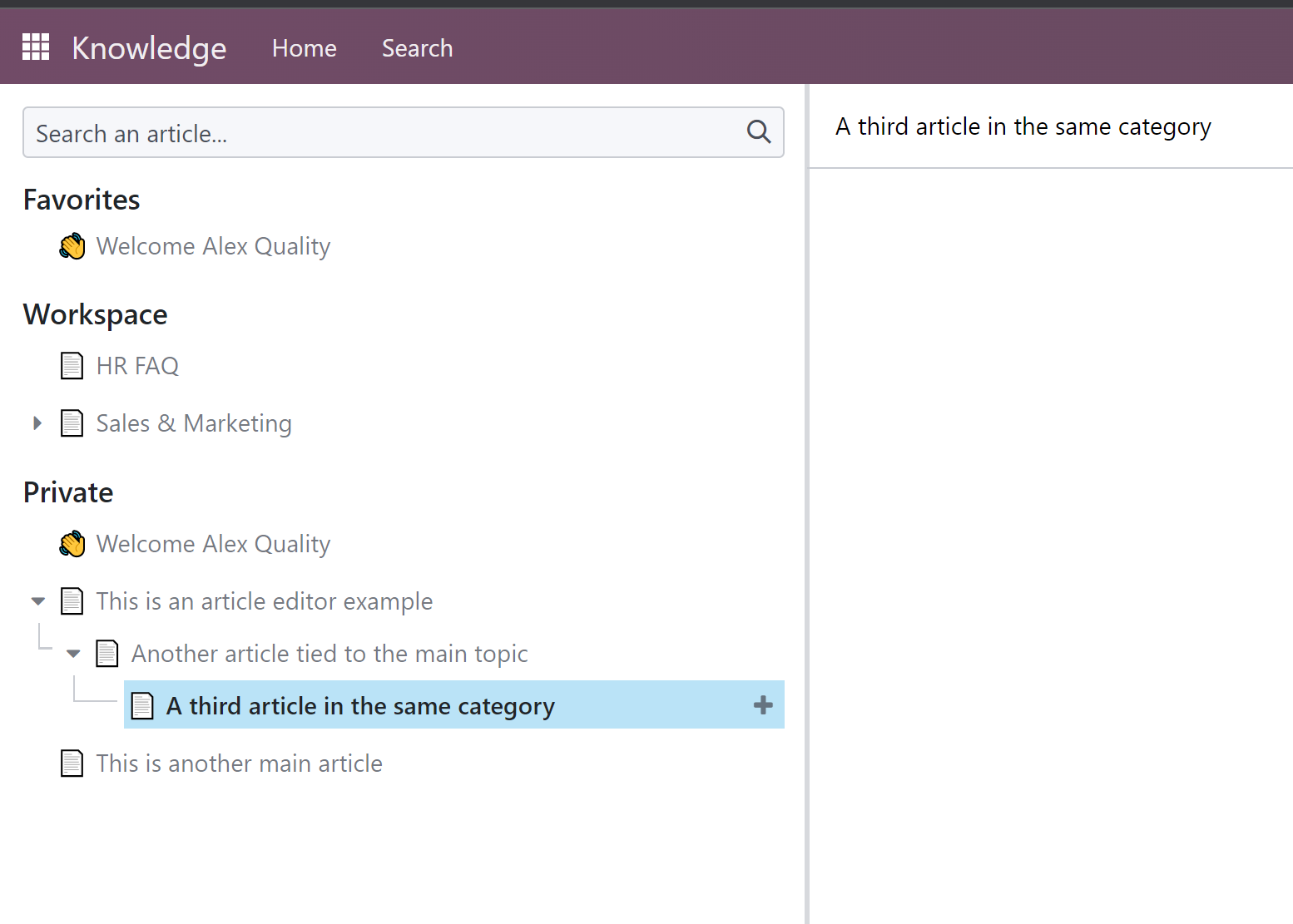 Organiseringen av Odoo kunnskapsbaseartikkel er også ganske bra. Selv om det ikke er noen mappe- eller kategorialternativer, kan du opprette artikkelnivåer eller “trær”. På denne måten kan du skrive en hovedartikkel om ethvert emne, og legge til underartikler under det, og effektivt skape et omfattende og strukturert hierarki. Å finne artiklene vil være ganske enkelt, men du må ta vare på navnene tidlig slik at du ikke vil skape forvirring for deg selv når antallet kunnskapsbaseartikler vokser betraktelig.