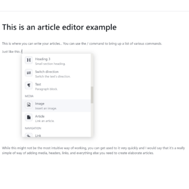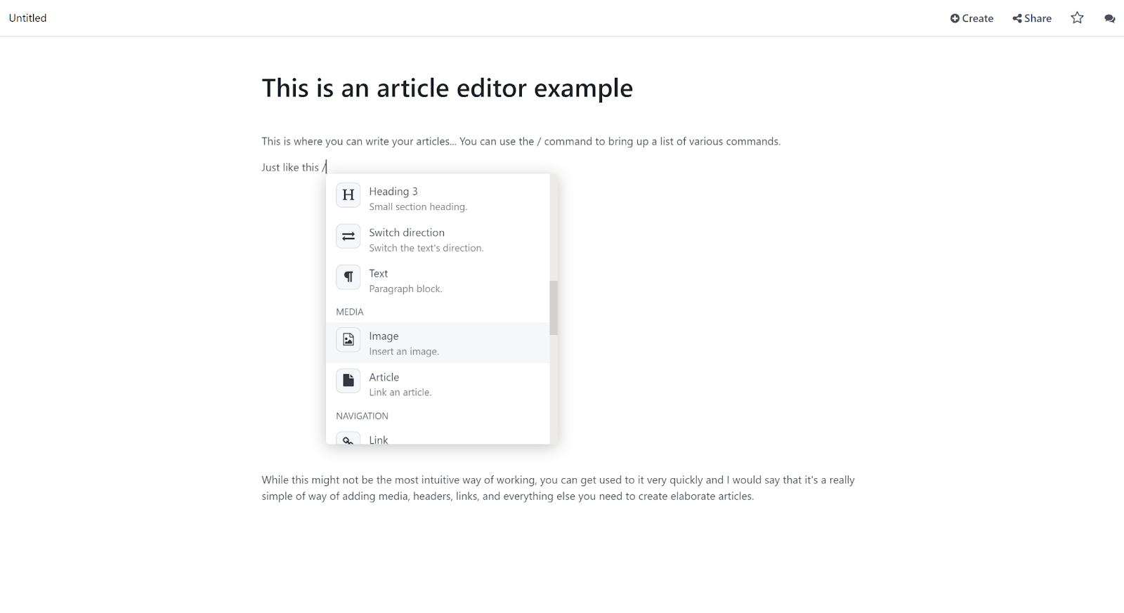 La oss nå ta en titt på kunnskapsbaseeditoren. Brukergrensesnittet her forblir like enkelt og effektivt som i resten av appen. Det er ikke noe distraherende for å trekke fokuset bort fra å skrive, og kunnskapsbase-editoren tilbyr all standard funksjonalitet du trenger for å skrive forseggjorte artikler med media og riktig formatering inkludert. Det som imidlertid er interessant i brukeropplevelsen er hvordan du kan få tilgang til all denne funksjonaliteten. Svaret er “/”.