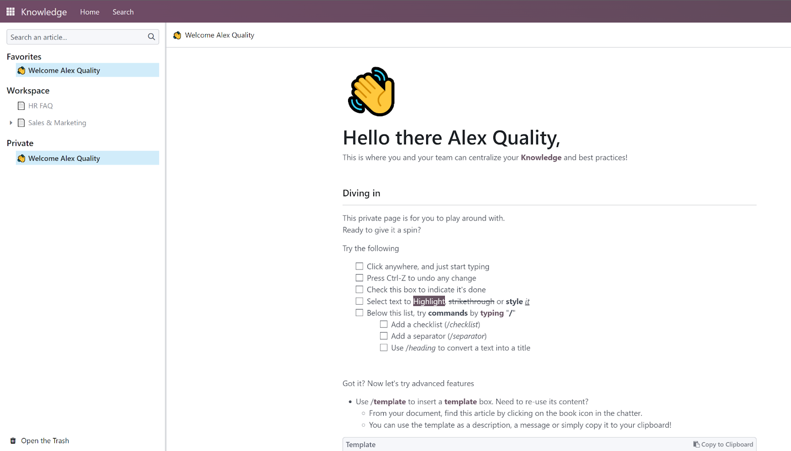 Odoo kunnskapsbase er en godt balansert og fullt utstyrt løsning som ikke vil skuffe noen type bruker. Enten du trenger at kunnskapsbasen din skal være lett eller tung på antall artikler, er artikkelorganiseringsfunksjonen god nok til å hjelpe deg med å holde styr på dem i de fleste tilfeller. Den atypiske tilgangen til funksjoner med en enkel skråstrek (/)-kommando er forvirrende i begynnelsen, men den fungerer så jevnt i daglig skriving. Totalt sett er Odoo kunnskapsbase rett og slett fantastisk, og det er vanskelig å finne noen avtalebrytere i denne rimelige løsningen.