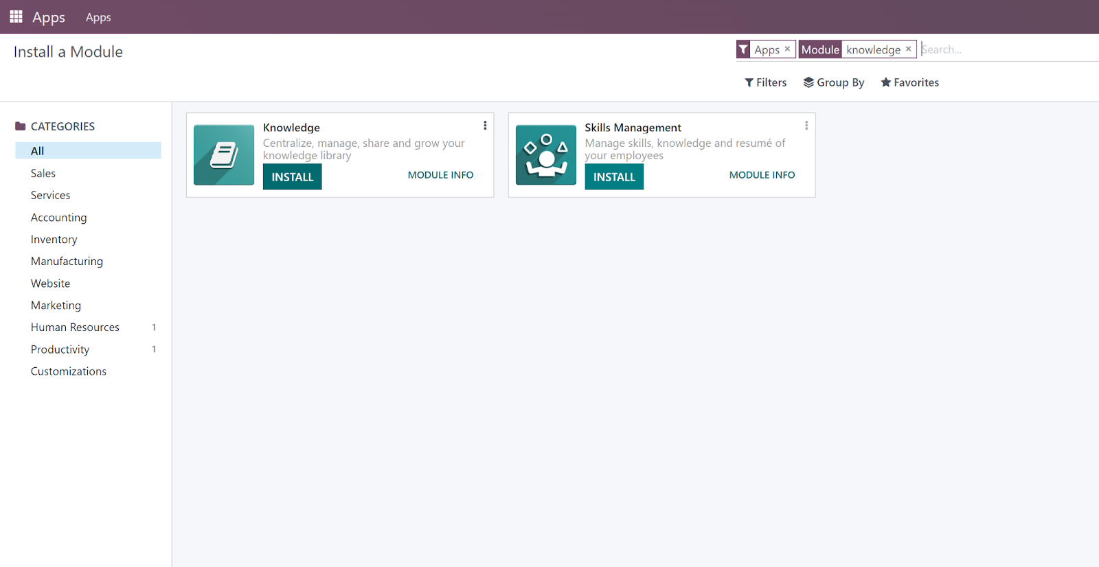 Du finner kunnskapsbasen i Odoo-appbutikken. Uansett hvilken type apper du velger når du oppretter kontoen din, kan du alltid legge til kunnskapsbasen senere. Bare søk etter “Knowledge” i appbutikken, og legg den til kontoen din.