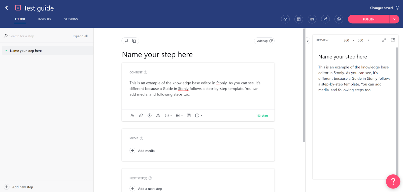 Uansett hva du velger, er det ingen tvil om at opplevelsen din vil være ganske jevn. Jeg valgte “Guide”-malen først, og jeg må si at grensesnittet forblir veldig fokusert. Denne veiledningsmalen behandler teksten din som en trinn-for-trinn-guide, slik at du kan fylle ut hvert trinn og legge til relevante medier – bilder, videoer, kode eller et forhåndsinnstilt ikon. Du kan også endre oppsettet til tre forskjellige varianter, se en forhåndsvisning, dele guiden og endre innstillingene for hver guide. Editoren tilbyr all standard tekstformateringsfunksjonalitet, samt tilleggsinnstillinger. Totalt sett er redaktøren ganske standard, og du får det du forventer.