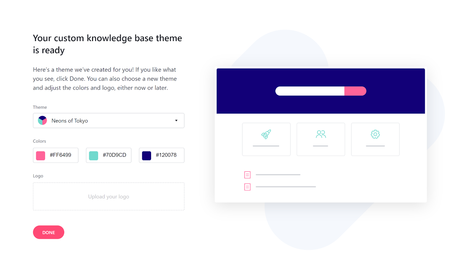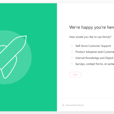 Alt som trengs for å komme i gang med Stonly er å opprette kontoen din. Du kan også velge en gratis prøveperiode først for å se om du vil like den. Det kreves ingen kredittkortinformasjon, og du får en enkel, men effektiv innføring i hvordan Stonly fungerer og hva som må gjøres for å komme i gang. Introduksjonen fungerer som et spørreskjema og har som mål å finne ut hvordan du ønsker å bruke Stonly. Hvis du velger kunnskapsbase-alternativet, vil Stonly automatisk ta deg til det første trinnet i å opprette det, og du begynner med å velge et malfargeskjema. De har noen flotte alternativer tilgjengelig, og du kan også legge til logoen din med en gang.