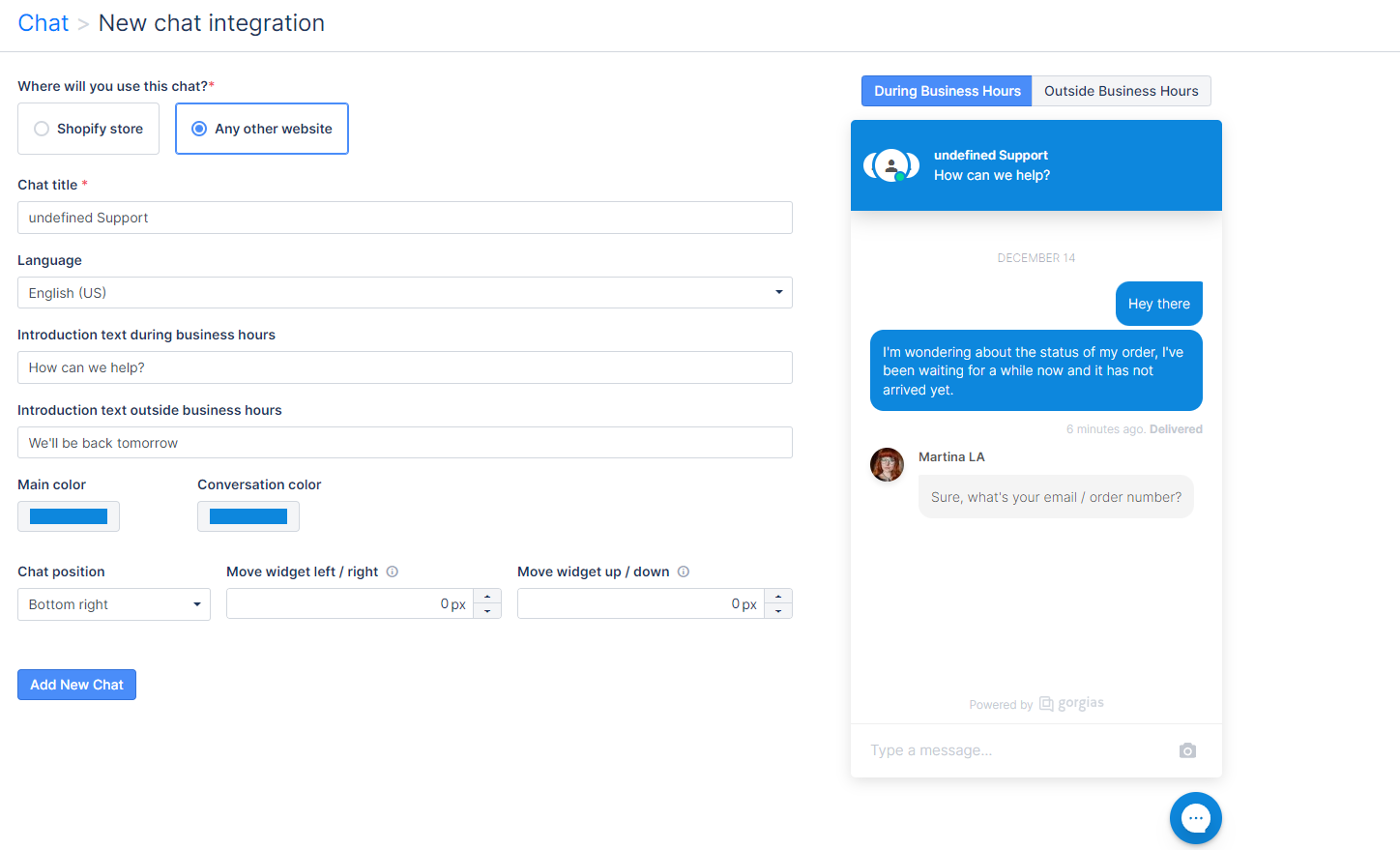 Gorgias’ live chat-programvare er enkel å sette opp og tilpasse. Den tilbyr noen grunnleggende innstillinger, men hvis du vil, kan du virkelig skreddersy den for å passe dine behov og merkevarebygging, legge til kampanjer i den, koble den til en butikk og så videre.