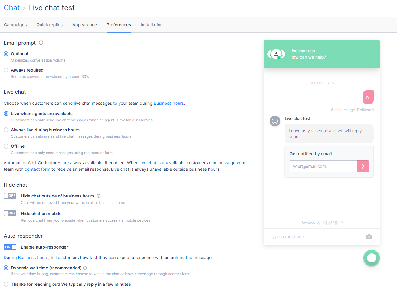 Du har mye rom for tilpasning når det gjelder å sette opp live chat-widgeten din. I tillegg til det første oppsettet, kan du alltid gå tilbake og legge til kampanjer, sette opp raske svar og justere preferanser, inkludert autosvar, forespørsler og tilhørende e-postintegrasjoner.