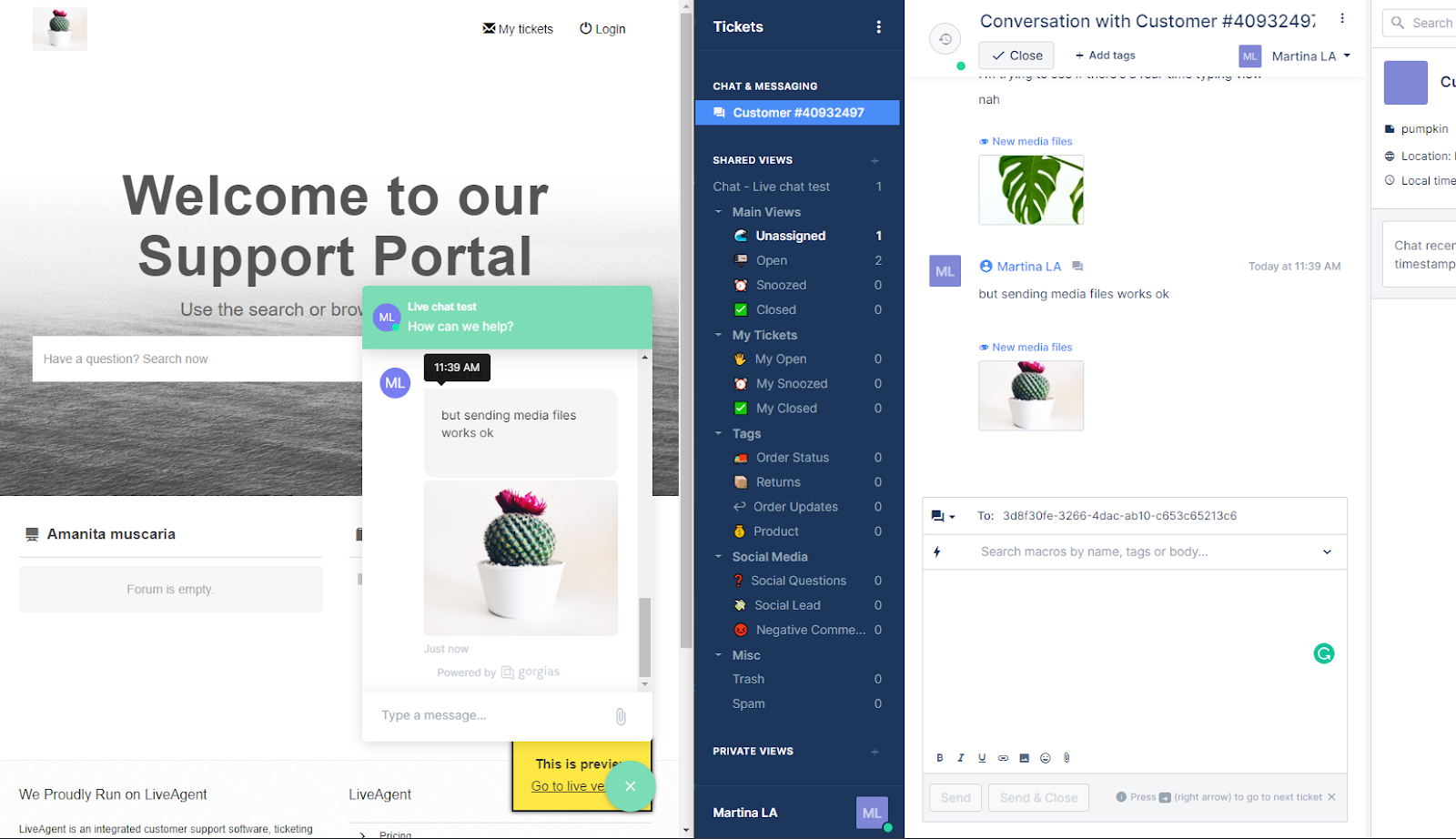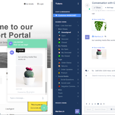 Jeg ble litt skuffet da jeg innså at Gorgias’ live chat ikke støtter forhåndsvisninger i sanntid. Men foruten det var widgeten deres reaktiv og hadde ingen problemer med å sende meldinger, inkludert mediefiler.