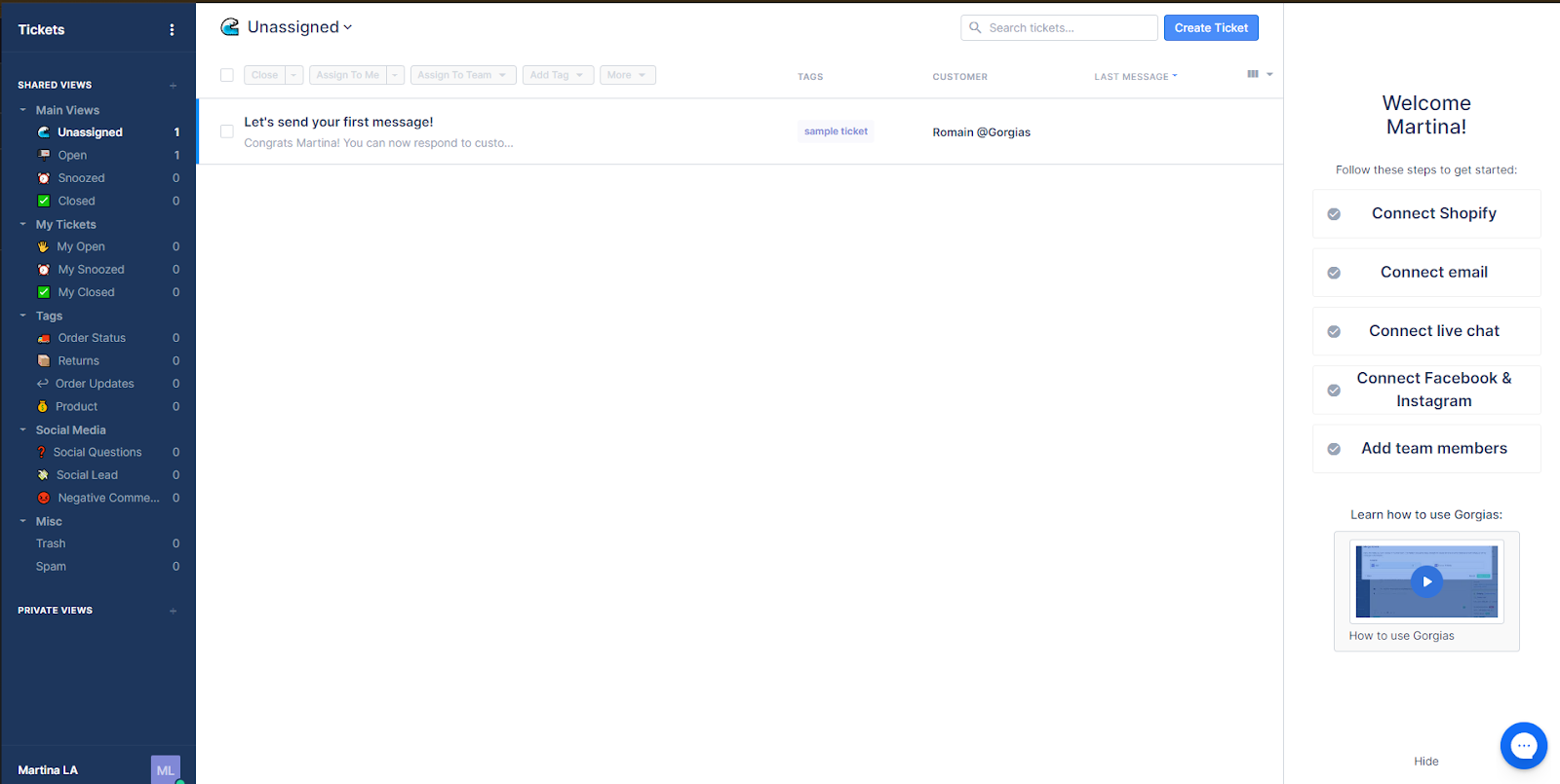 Min generelle erfaring med Gorgias var ganske hyggelig. De gjør kontooppsettet veldig enkelt, og navigering i grensesnittet er intuitivt helt fra starten. Brukergrensesnittet er enkelt, rent og lett å bruke.