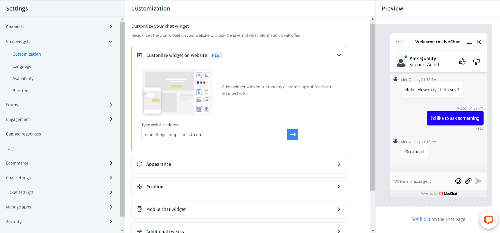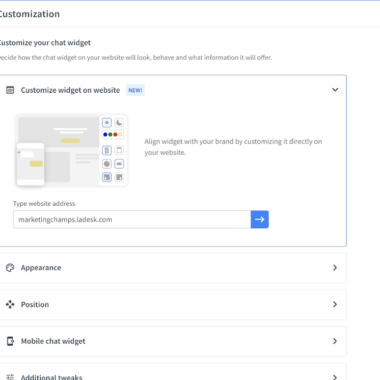 Du kan tilpasse chat-widgeten din i LiveChat-innstillingene. Alternativene er ganske omfattende, så hvis du har lyst til å bli kreativ, kan du justere live chat-widgeten til dine preferanser, eller til din kundemerkevare. Valgene dine inkluderer hvordan vinduet ditt kommer til å se ut i maksimert og minimert visning, lyst eller mørkt tema, temafarge (støttet egendefinert farge) og chat-posisjon. Det er også muligheten til å skjule widgeten, tilpasse mobilversjonen av chat-widgeten din, og flere justeringer der du kan vise firmalogoen, agentbildet, aktivere eller deaktivere lyder, tillate chat-vurderinger og et par flere alternativer.