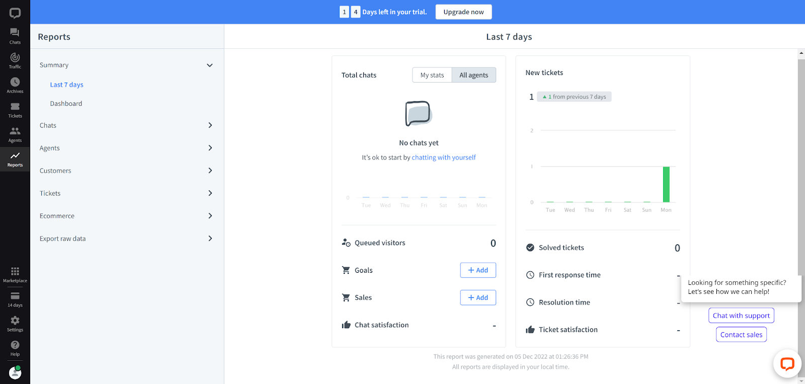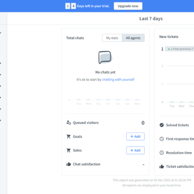 Analysefunksjonene gir en rask oversikt, så vel som dyptgående oversikter over alt relatert til live chat – chatter, agenter, kunder, billetter og e-handel. Hver seksjon kan gi deg mer informasjon og konkrete tall om live chatten din. Det mangler ikke noe. Analyseoversikten gir deg oversikt over alt som har skjedd de siste sju dagene du har brukt den.