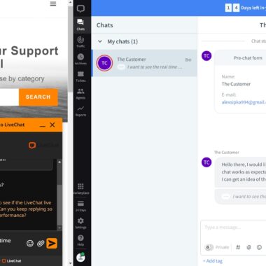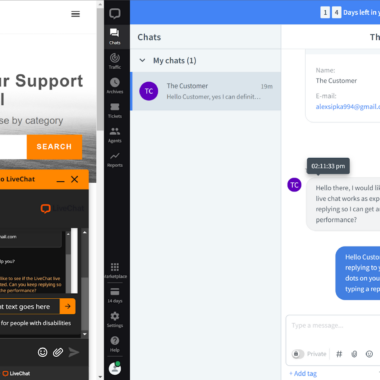 Jeg så på LiveChat live chat-widgeten fra begge sider – fra perspektivet som både agent og som kunde for å få den fulle opplevelsen, og jeg kan si at alt fungerte bra, som forventet. Da jeg startet chatten som kunde, kom det en automatisk melding møtte meg med en gang (du kan tilpasse denne meldingen i innstillingene, under Målrettede meldinger). Med LiveChat-dashbordet åpent, fikk jeg umiddelbart en visuell og et lydvarsel om en ny innkommende melding. Nettleserfanen fortsetter også å gi deg et varsel til du bestemmer deg for å klikke på den. Så langt så bra.
