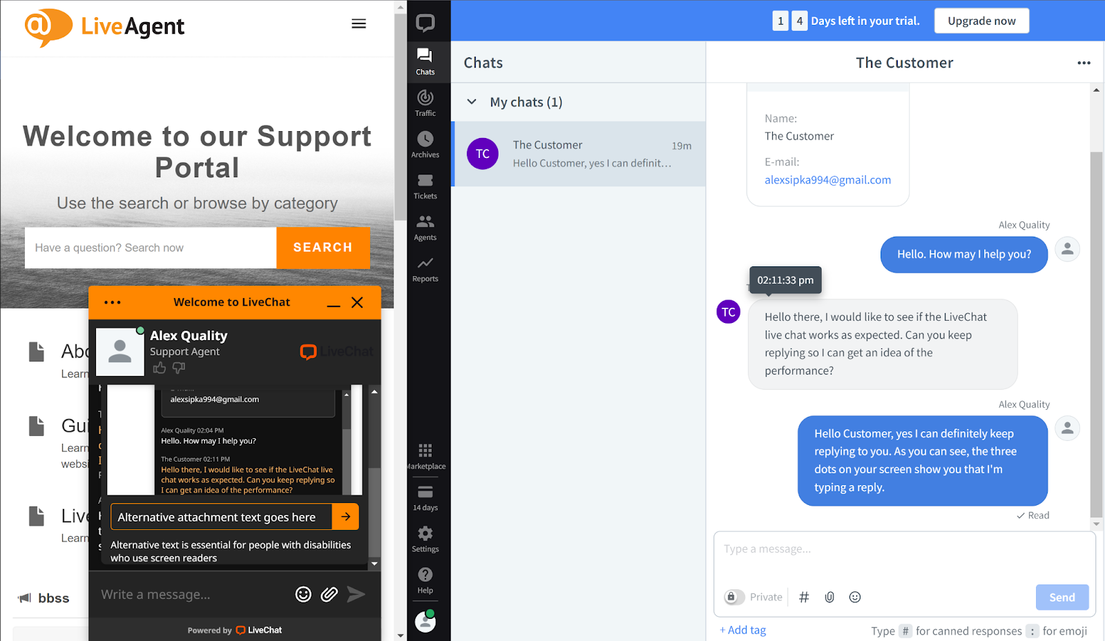 Jeg har også gitt en virvel til å sende filvedlegg. Når du klikker på filvedleggsikonet, kan du umiddelbart velge en fil og sende den. Du kan slette vedlegget når som helst før sending. I motsetning til sniktittet på meldingen, kan ikke agenter se et vedlegg hvis det ikke er sendt ennå, så kundens personvern bevares i tilfelle de legger ved feil fil. Vedlegget gir deg til og med en mulighet til å inkludere en alternativ tekst for personer med nedsatt funksjonsevne. En veldig gjennomtenkt og ekstremt nyttig inkludering.