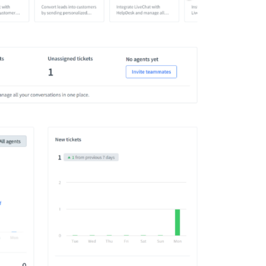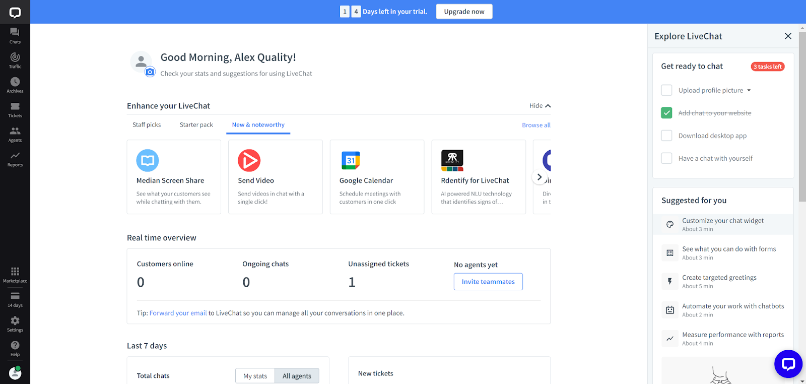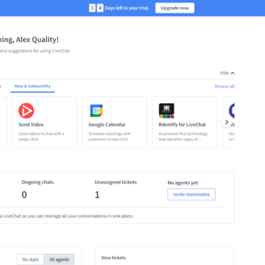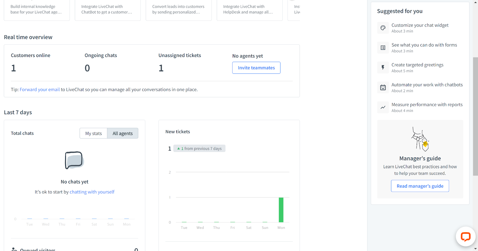 LiveChat er en etablert profesjonell løsning, og grensesnittet følger det. Det er lett å bli kjent med de fleste verktøyene, og du vil ikke gå deg vill takket være enkle anbefalinger i høyre panel. Du kan se chatter, trafikk, billetter, arkiver, kontakter og mer i panelmenyen til venstre. Midt på dashbordet presenterer noen forbedringsalternativer, og en rask sanntidsoversikt over live chat-statistikk.