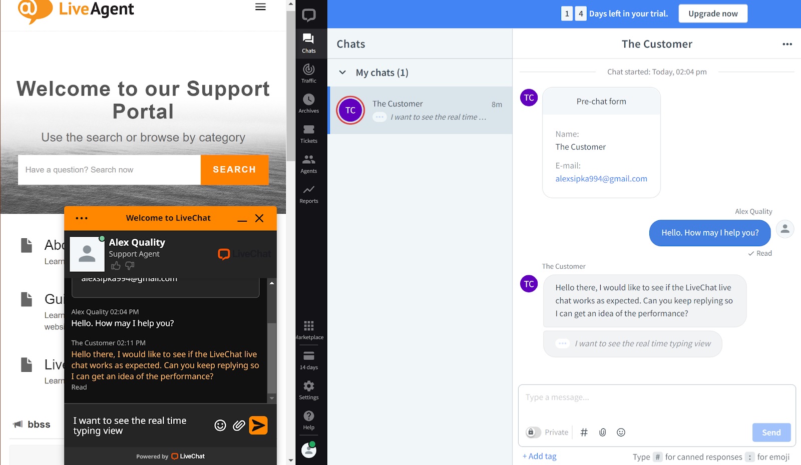 Meldingssniken fungerte perfekt, og den fanget opp det jeg skrev på under et sekund. Meldingen forblir på skjermen når brukerne ikke trykker på send-knappen, slik at du kan få de andre meldingene dine klare. I mellomtiden ser kunden tre prikker som varsel om at agenten skriver et svar til dem. Det fungerer generelt veldig bra. Svarhastighetene er nesten umiddelbare, uten lange ventetider overhodet.