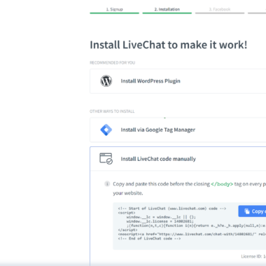 LiveChat-registrering er veldig rask. Du må ganske enkelt registrere kontoen din, og registreringsprosessen vil til slutt ta deg rett til integrasjonsdelen for live chat-widgeten, noe som betyr at du kan implementere live chat så snart du starter. Dette er overraskende raskt, og LiveChat gir deg til og med et par integreringsalternativer. Du kan velge mellom en WordPress-plugin, Google Tag Manager eller manuell live chat-kodeinstallasjon.