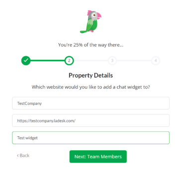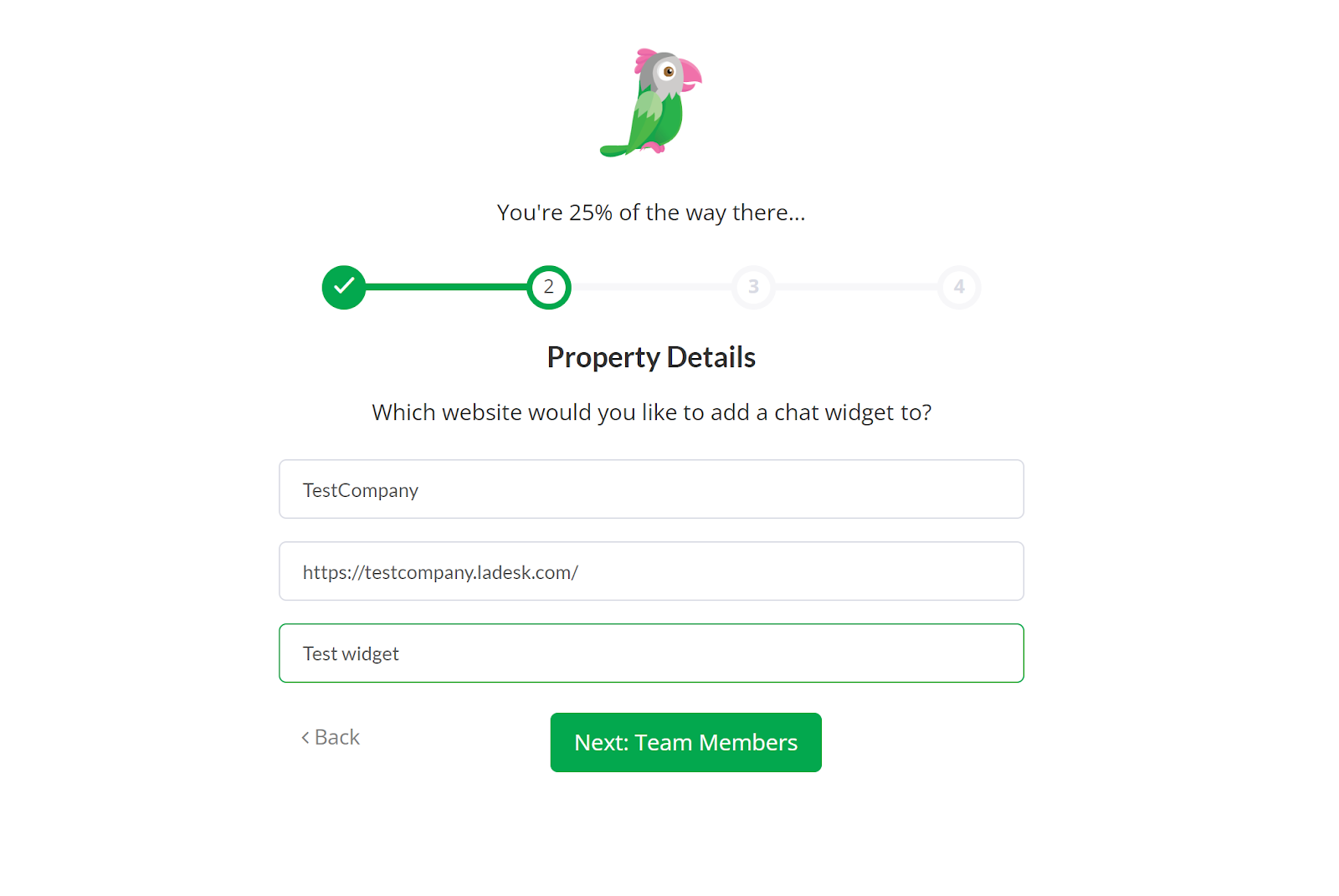 Tawk.to har en veldig enkel registreringsprosess som krever bare ditt navn, e-post og passord i det første trinnet. Det andre trinnet spør deg om nettstedet ditt, og tilbyr deg å navngi chatten din, samt muligheten til å oppgi navnet på nettstedet ditt. Det er en av de raskeste registrerings- og implementeringsprosessene du kan få med programvare for live chat.