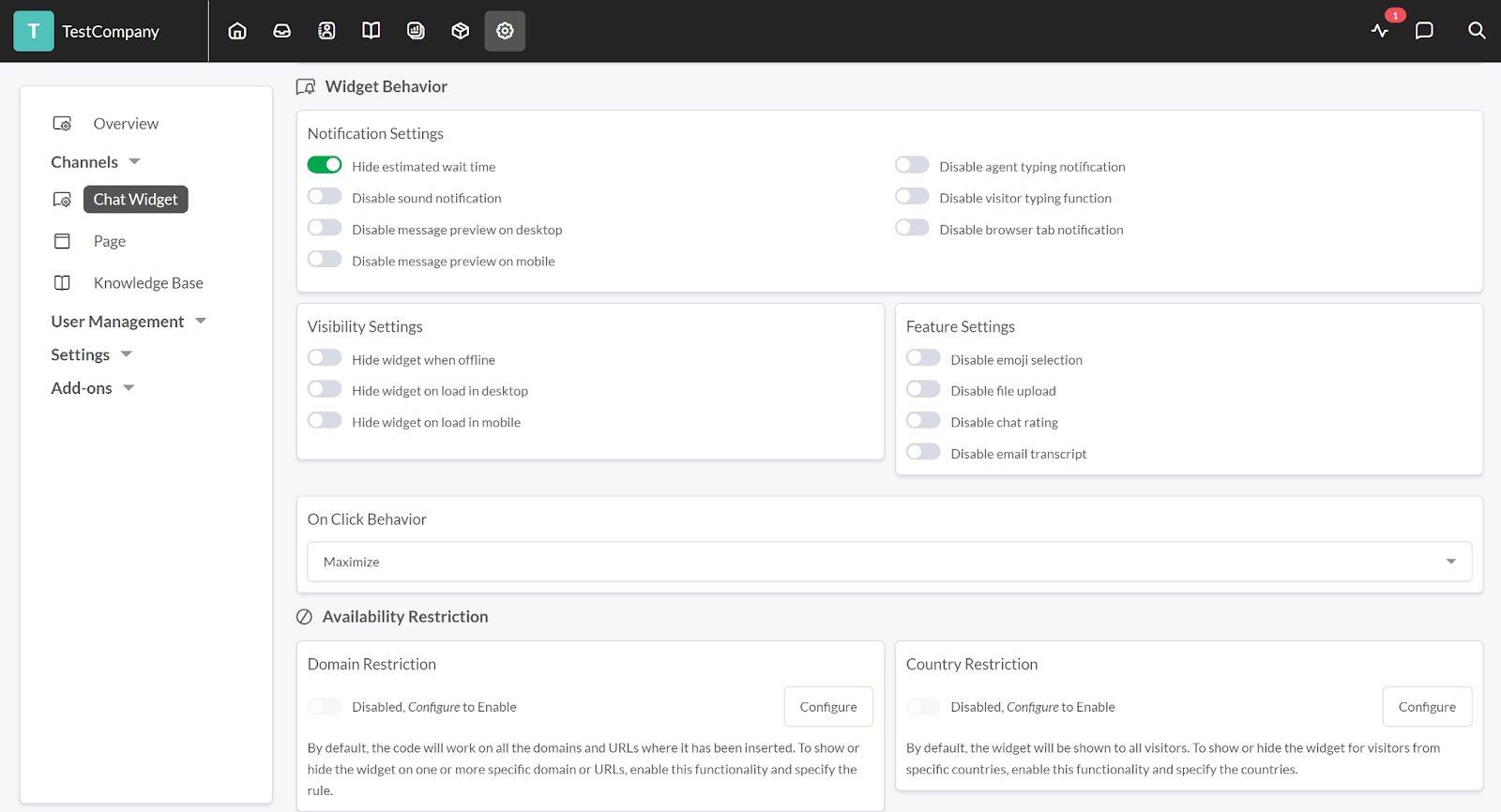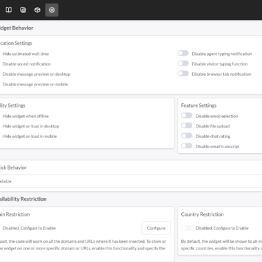 Å gå inn i Tawk.to chat-innstillingene avslører enda flere funksjoner og alternativer som ikke er nevnt på hovednettstedet for live chat. Du kan angi utløste meldinger, e-postvarsler og webhooks. Det er mange andre tilpasningsalternativer under chat-widget-fanen, og du kan justere og endre nesten hver widget-atferdsfunksjonalitet som er tilgjengelig.
