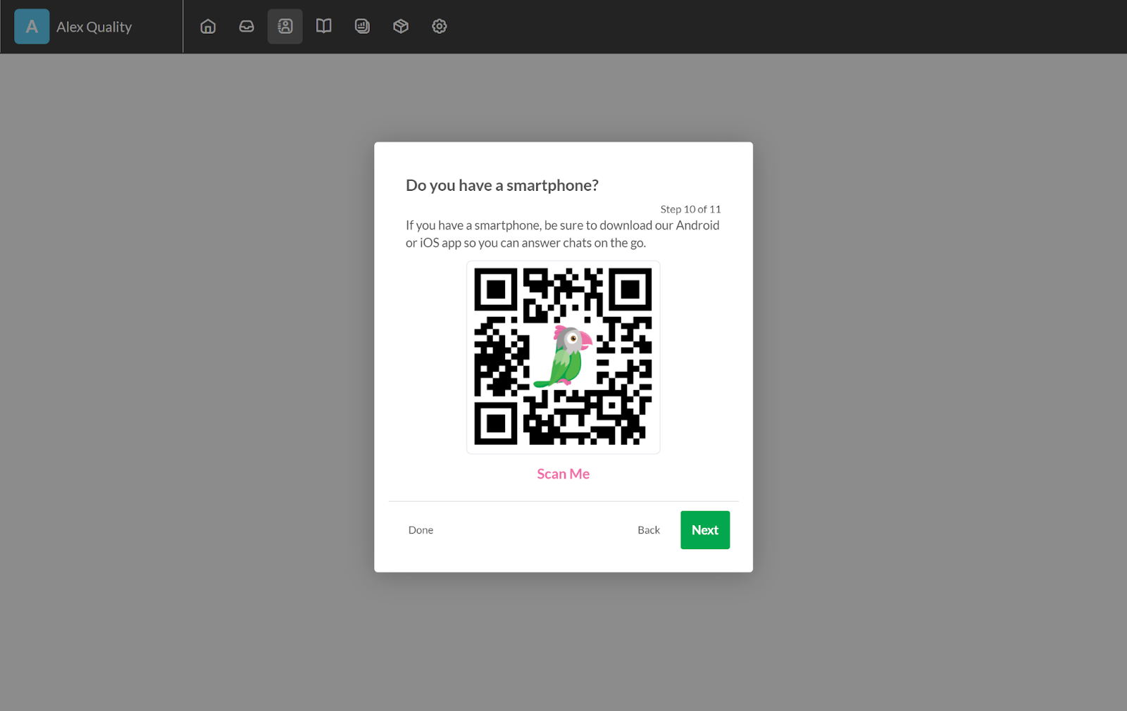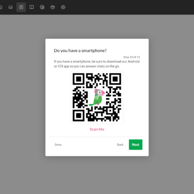 Grensesnittet vil bli introdusert med en opplæring som kan hoppes over, men jeg anbefaler alle å gå gjennom den. Brukergrensesnittet er ikke vanskelig å navigere uten, men guiden er veldig kort og veldig godt laget, noe som gjør det verdt det å prøve ut. De siste trinnene i veiledningen vil gi deg muligheten til å laste ned Tawk.to-mobilapplikasjoner via en QR-kode, som er et annet flott tillegg.