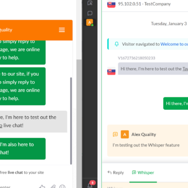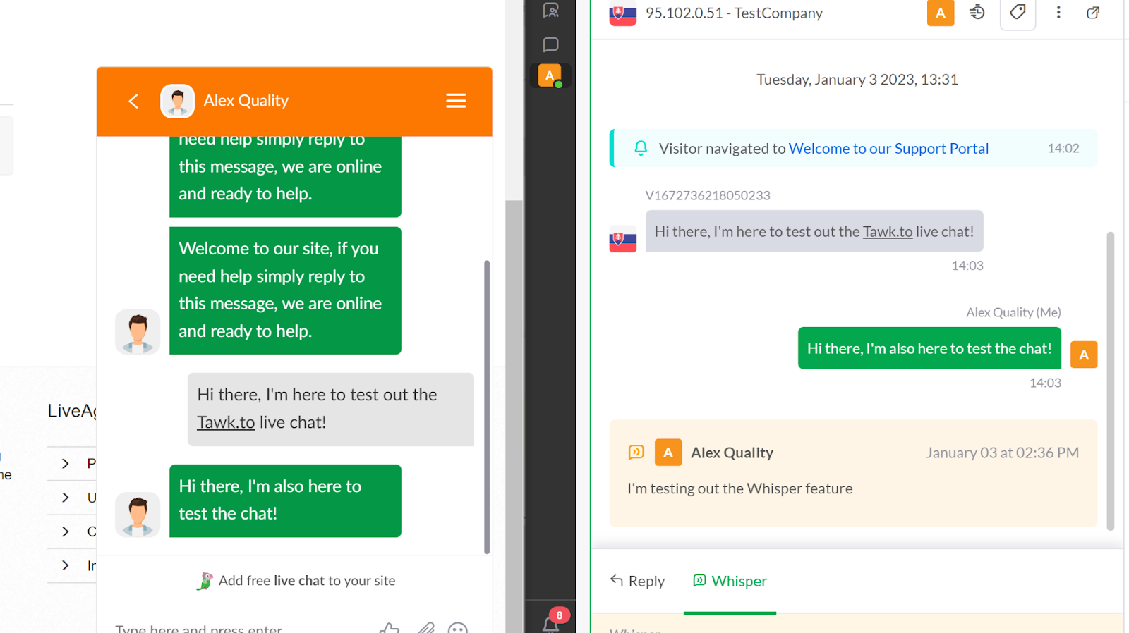 Det samme skjer på agenten sin side av chatten. Jeg oppdaget en ny funksjon kalt Whisper. Denne funksjonen fungerer i hovedsak som en merknad for andre agenter. Du kan skrive det direkte i chattevinduet og kundene vil ikke se det. Resten av funksjonene på agentsiden er stort sett de samme som for kunden, bortsett fra at du får se den tilgjengelige kundeinformasjonen som Tawk.to har tilgang til.