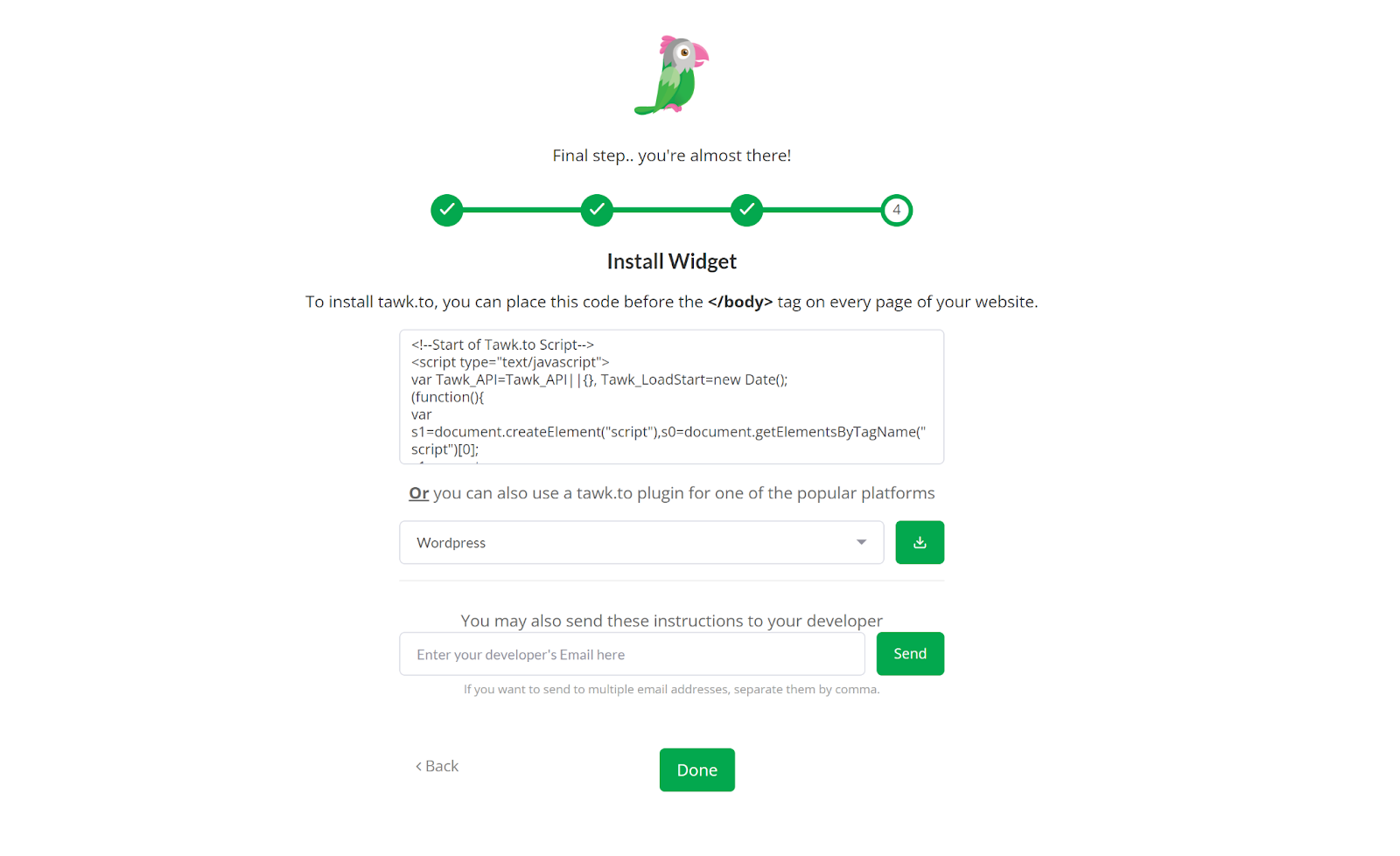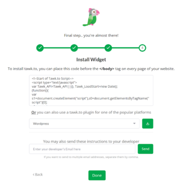 Det beste er at du kan implementere live chat-koden nesten umiddelbart, fordi du får muligheten under registreringsprosessen. Implementeringen kan gjøres på flere måter. Du kan kopiere og lime inn koden til nettstedet ditt, eller velge en integrasjon med populære nettbyggingstjenester. Du kan tilpasse live chat-widgetens utseende og oppførsel senere i applikasjonen. Etter det kan du begynne å surfe rundt i grensesnittet og bli kjent med nettapplikasjonen Tawk.to.