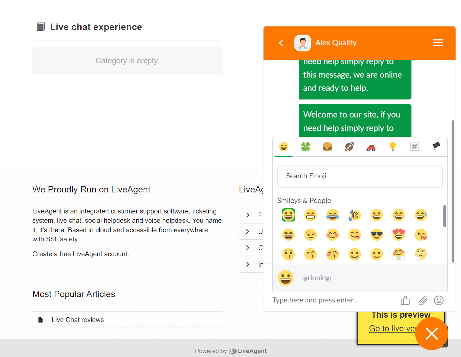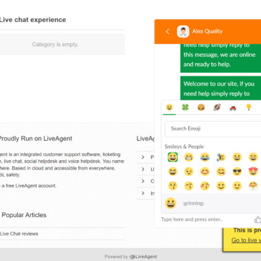 Tawk.to live chat-widget ser bra ut på nettstedet. Jeg valgte det grunnleggende oppsettet med bare en enkel fargeendring. Når du klikker på den som kunde, vil widgeten be deg først sjekke brukerstøtten for tilgjengelige svar. Dette er en ganske god funksjonalitet, siden den kan redusere chatbelastningen på agenter og oppmuntre brukere til å finne svar på egenhånd først. Uansett kan du starte chatten og hoppe over dette alternativet.