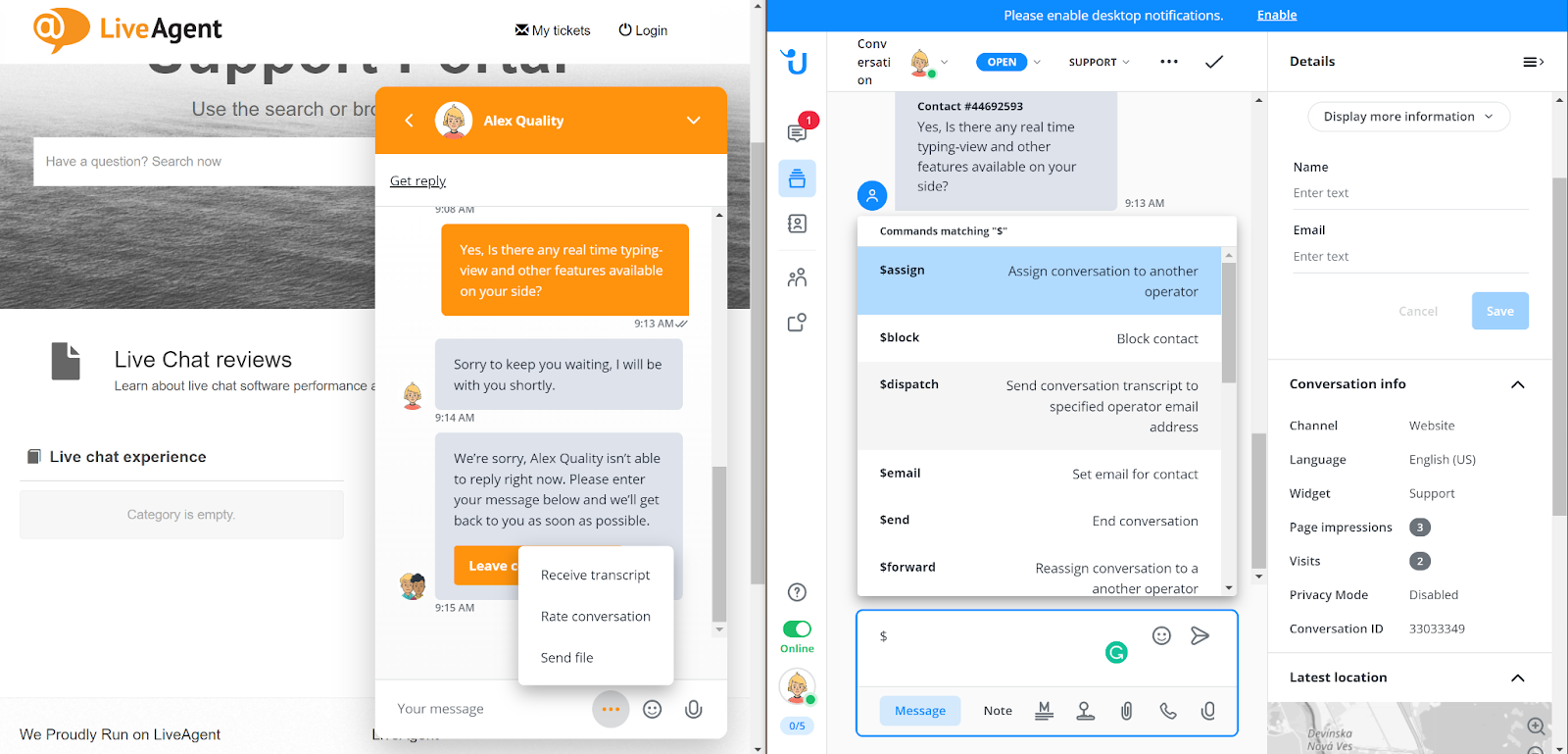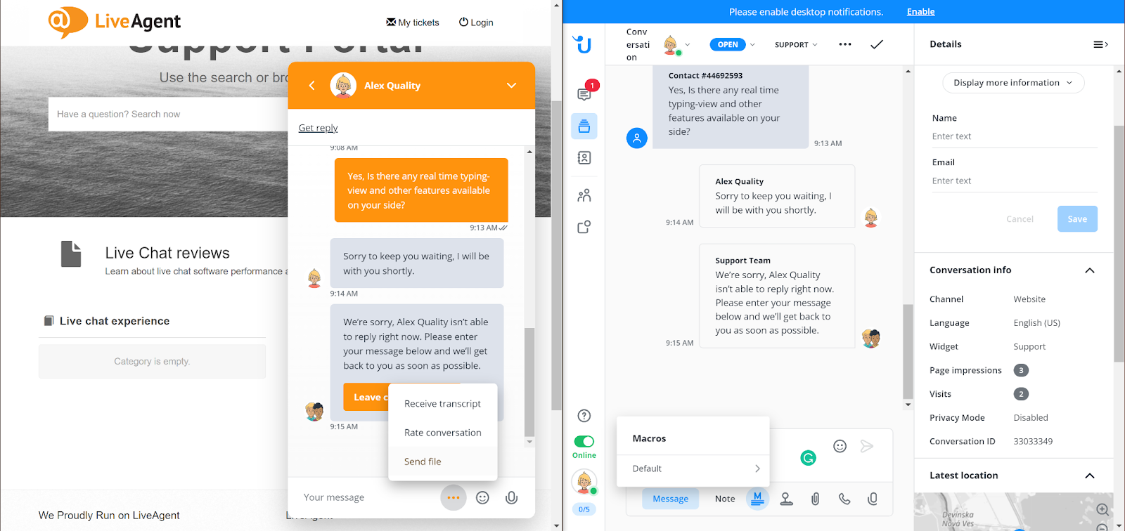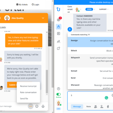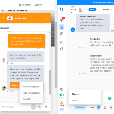 Kundesiden av widgeten inkluderer standardalternativene for å sende, legge til smilefjes og til og med overføre filer og be om en chat-utskrift. Disse funksjonene er flotte og veldig nyttige for kunder. Det som er fint er at det ikke er noe som vil være rotete eller anmassende for kundene. Det samme gjelder agentsiden av chattevisningen, men med flere tilgjengelige alternativer – send makroer, tilby en samtale, send vedlegg, ta opp en talemelding og utløs kommandoer.