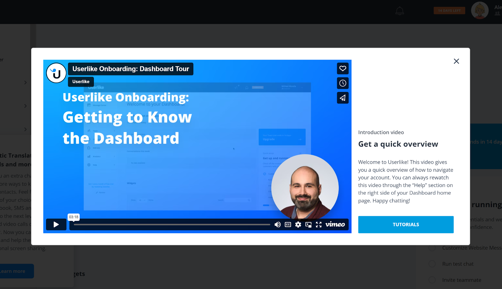 Å begynne med Userlike er enkelt. Du trenger bare å registrere deg for en gratis prøveversjon eller velge en plan hvis du er interessert i den helt fra starten. Som de fleste programvarer, vil Userlike stille deg et par spørsmål om formålet med bruken, og om din bedrift. Det er en enkel prosess, og du kan bli ferdig med den veldig raskt. Etterpå vil du bli presentert med en velkomstvideo for å vise deg hvordan det fungerer. Du kan hoppe over det hvis du vil, men det er lurt å ha en kom-i-gang-guide i starten.